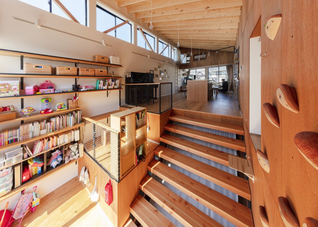 Phần cầu thang được thiết kế đa năng vừa để nâng không gian sinh hoạt lên tầng 2, cửa sổ ở phía Nam và Đông tạo không gian thông thoáng, vừa là nơi trẻ có thể tham gia các hoạt động liên kết với hệ tường gỗ có các mấu gỗ leo núi.