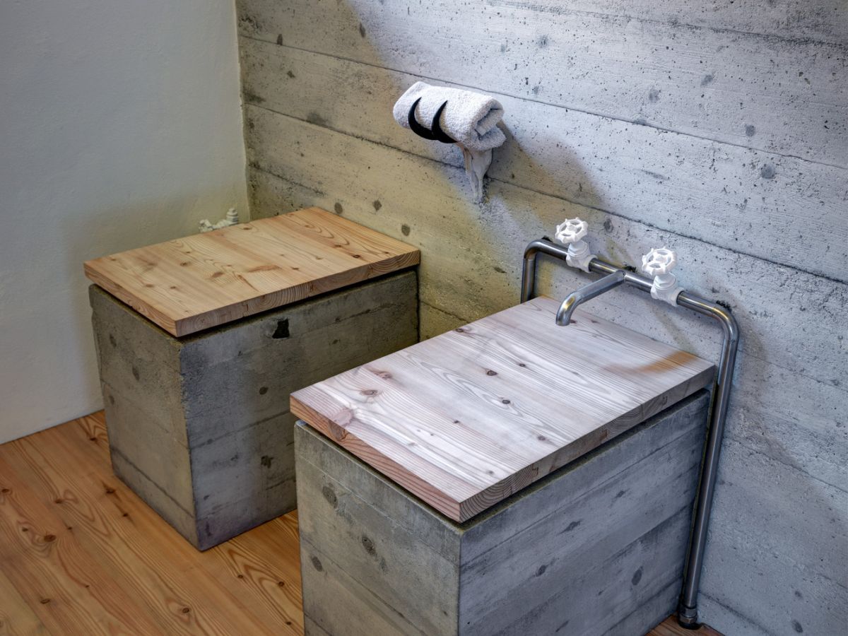 Rất nhiều tính năng trong thiết kế nội thất đã được điều chỉnh trong ngôi nhà này. Phòng tắm với các đồ nội thất và phụ kiện được thiết kế một cách tối giản để phù hợp với yêu cầu và hạn chế của vật liệu. Bàn ăn là một sự kết hợp tuyệt đẹp giữa gỗ tự nhiên và sơn trắng.