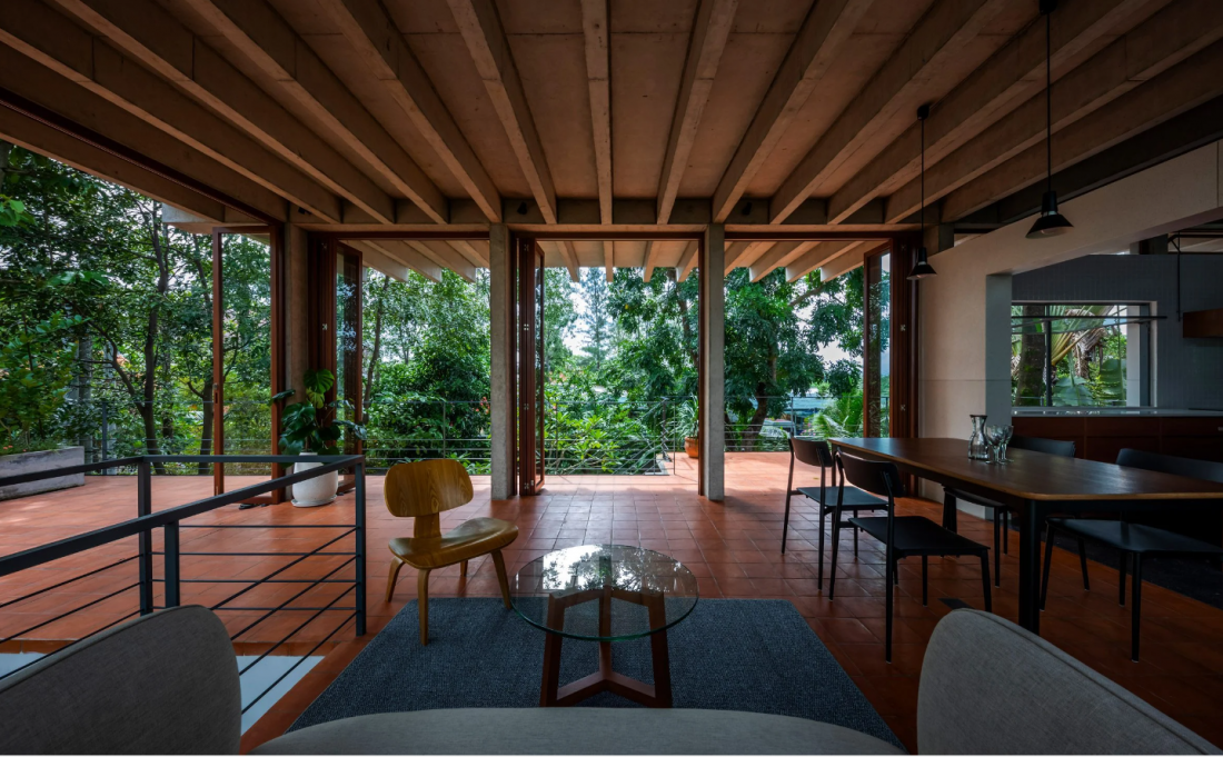 Tận dụng mảng xanh thiên nhiên bao quanh, ngôi nhà đã thay những bức tường ngăn cách bằng hệ cửa kính gấp tạo cảm giác bên trong với bên ngoài như hòa vào làm một.