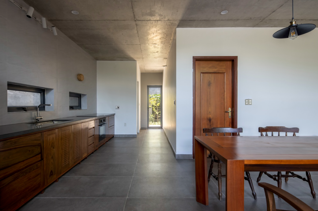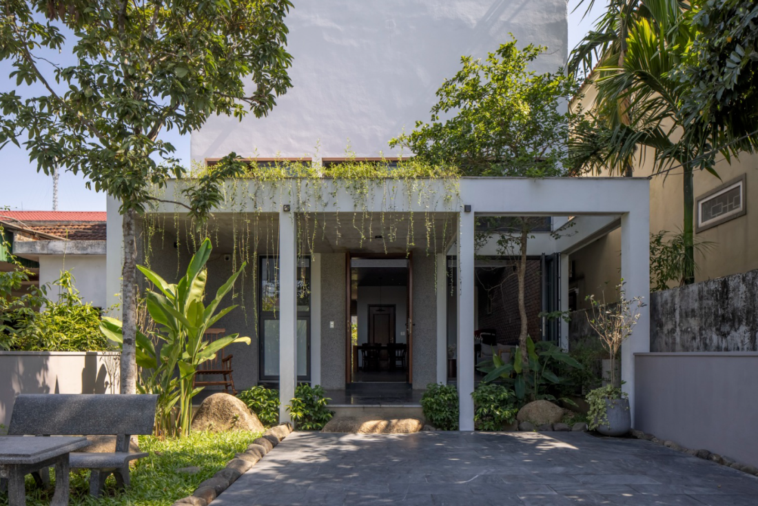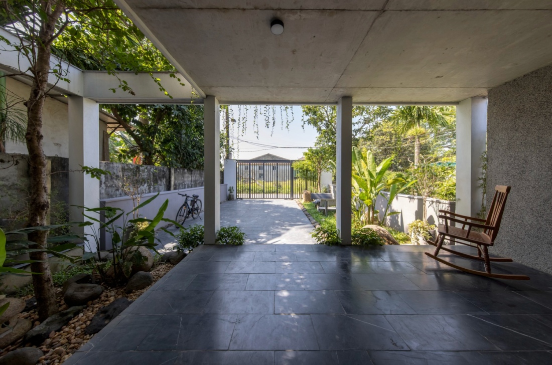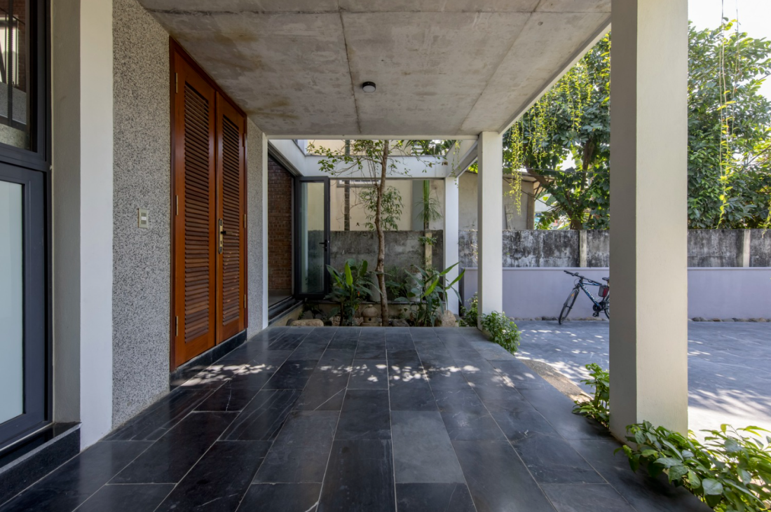 Khi tiếp cận vị trí căn nhà kiến trúc sư nhận ra thiết kế kiến trúc tại đây có điểm chung là sân lớn phía trước, tiếp đến là khoảng hành lang dài – nơi chuyển tiếp khu vực bên trong không gian sinh hoạt chính. Bên trong không gian sống, ranh giới giữa trong và ngoài được phân định bởi hệ thống cửa.