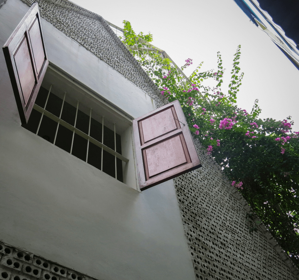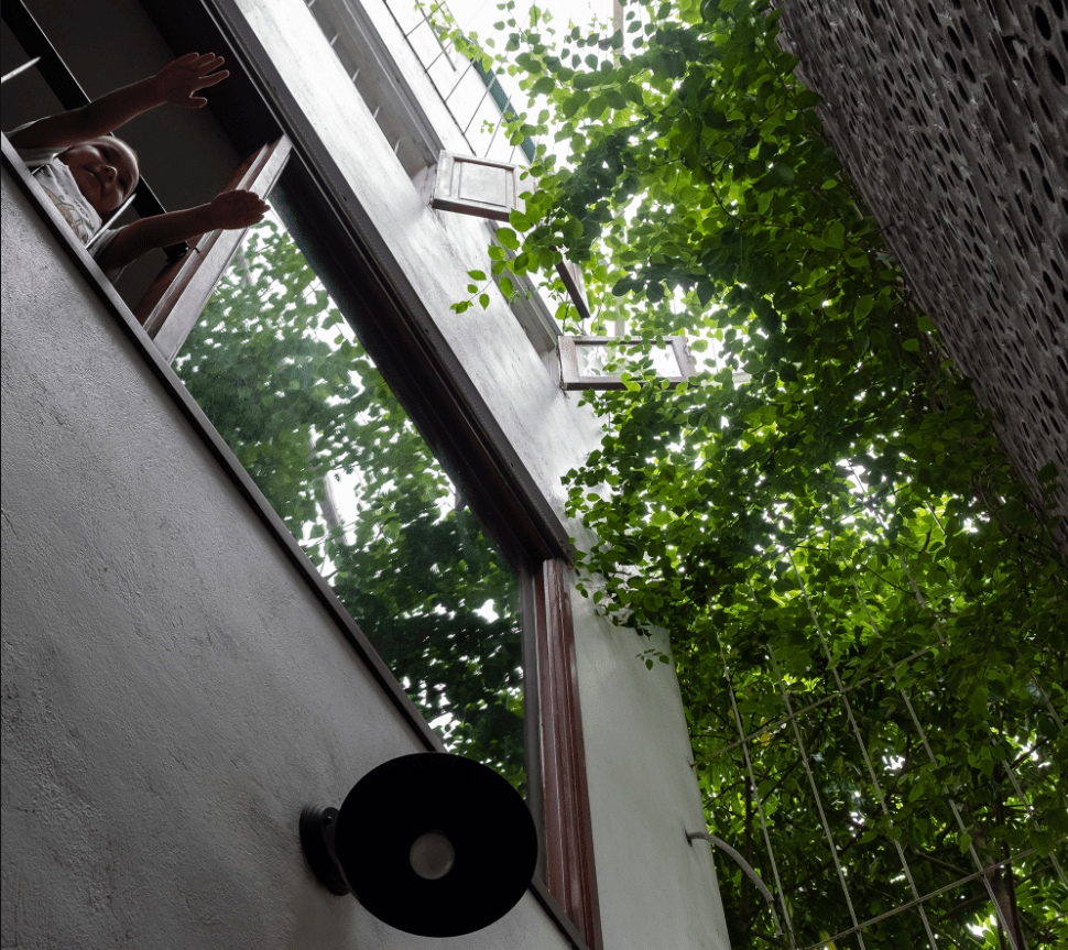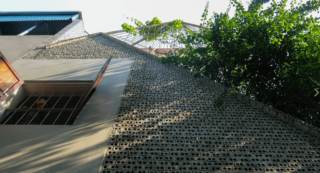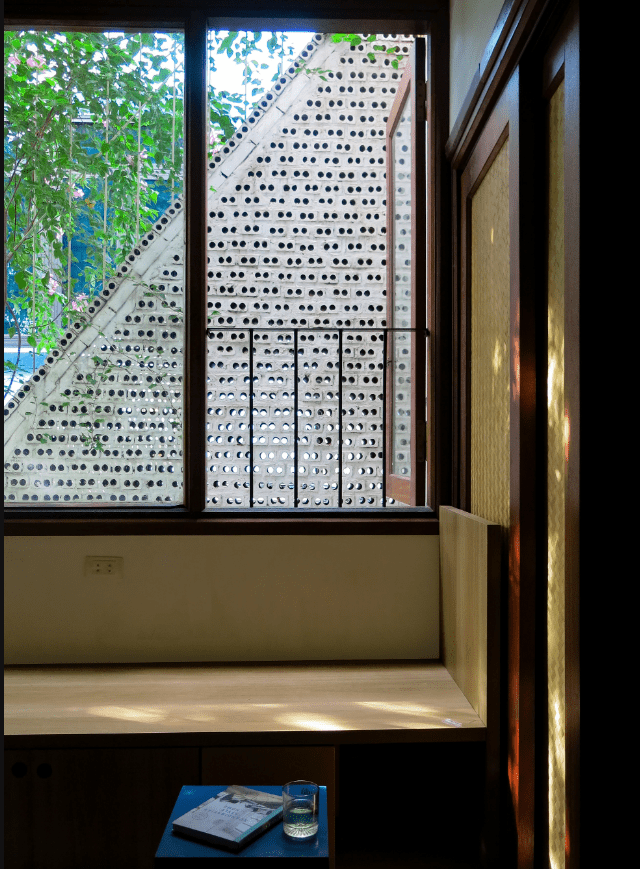 Điểm nổi bật dễ thấy là mặt tiền đục lỗ nhằm giảm thiểu việc sử dụng bê tông, tường gạch đục lỗ kết hợp hệ thống giàn cây leo. Giải pháp này có tác dụng che nắng, thông gió, giảm tiếng ồn hiệu quả và chống bức xạ nhiệt. Trong khi đó lớp tường gạch đặc và cửa sổ kính cường lực bên trong tạo sự riêng tư cho không gian sống.