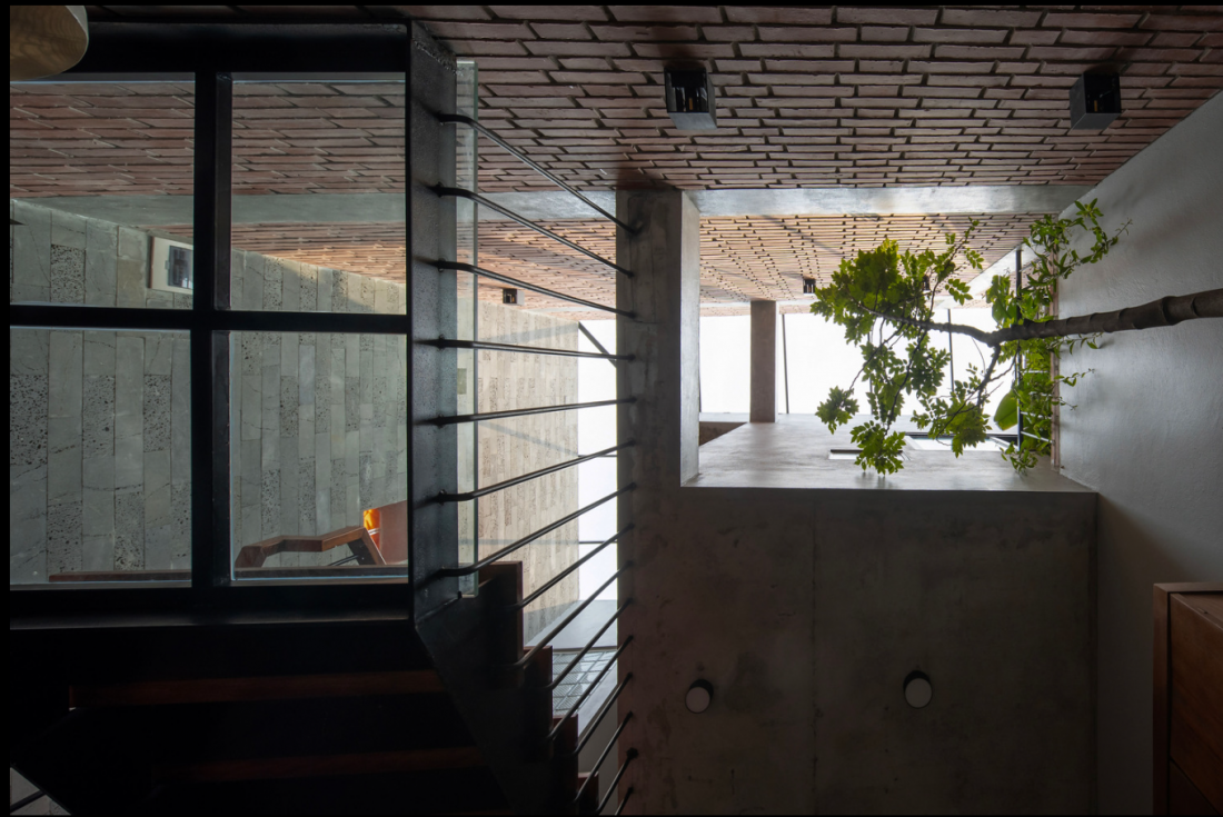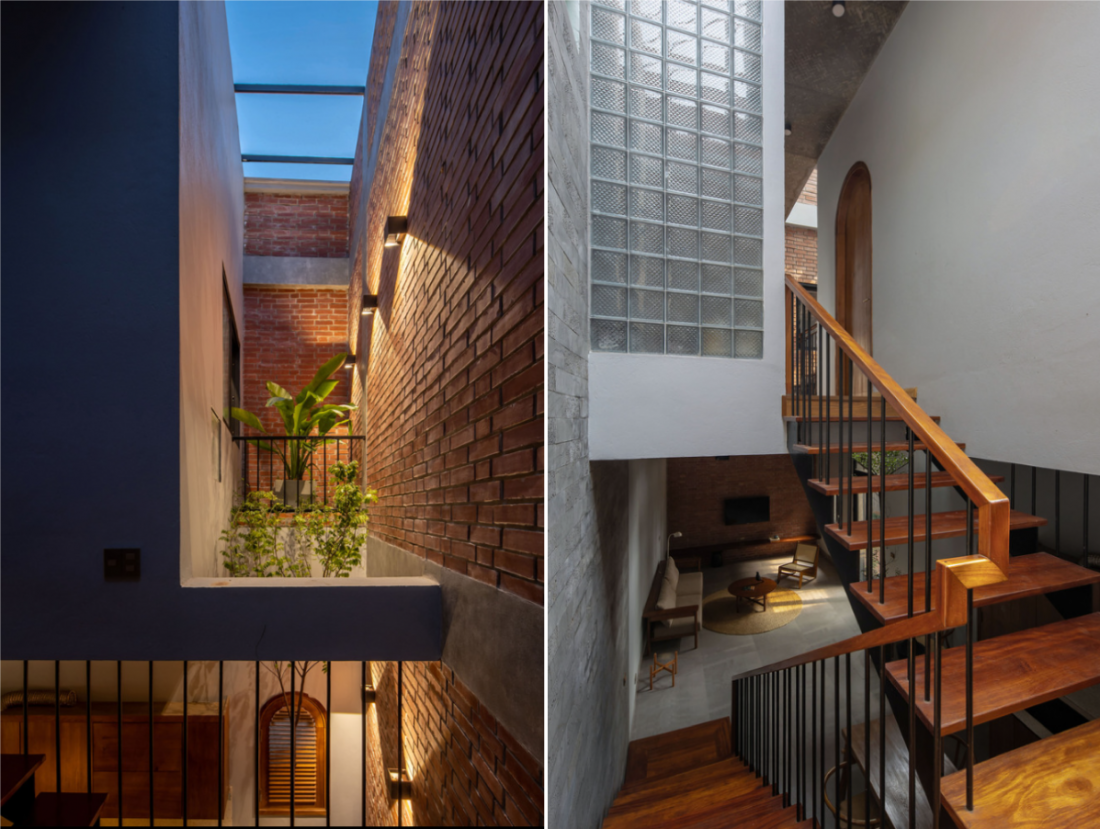 Điểm nhấn của ngôi nhà ống là có 2 giếng trời ở trung tâm và cuối nhà. Khoảng thông tầng giúp lấy sáng và lưu thông không gian nên trong nhà luôn thông thoáng, mát mẻ. Hơn nữa các thành viên dễ dàng kết nối, trao đổi với nhau mà không có sự ngăn cách giữa các tầng.