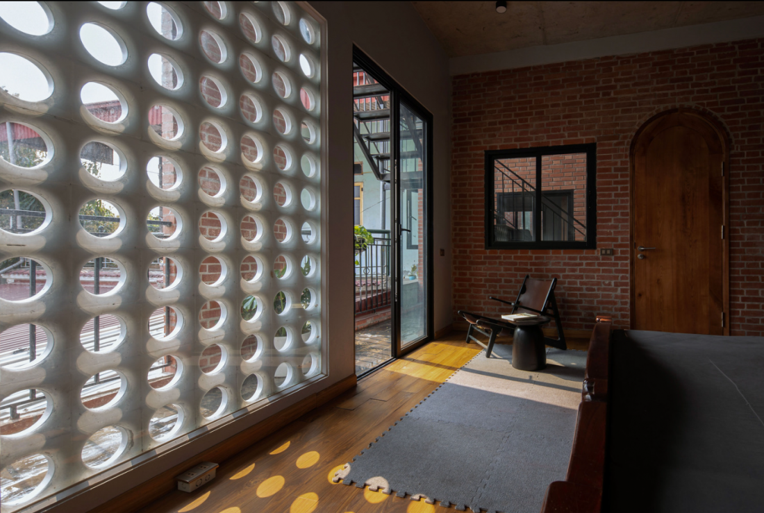 Ngôi nhà với diện mạo bao quanh với nhiều lớp viên gạch ngói đục lỗ được xây dựng trên mảnh đất có diện tích 450m2 nằm trong khu đô thị mới đang phát triển ở thành phố Phủ Lý, tỉnh Hà Nam.