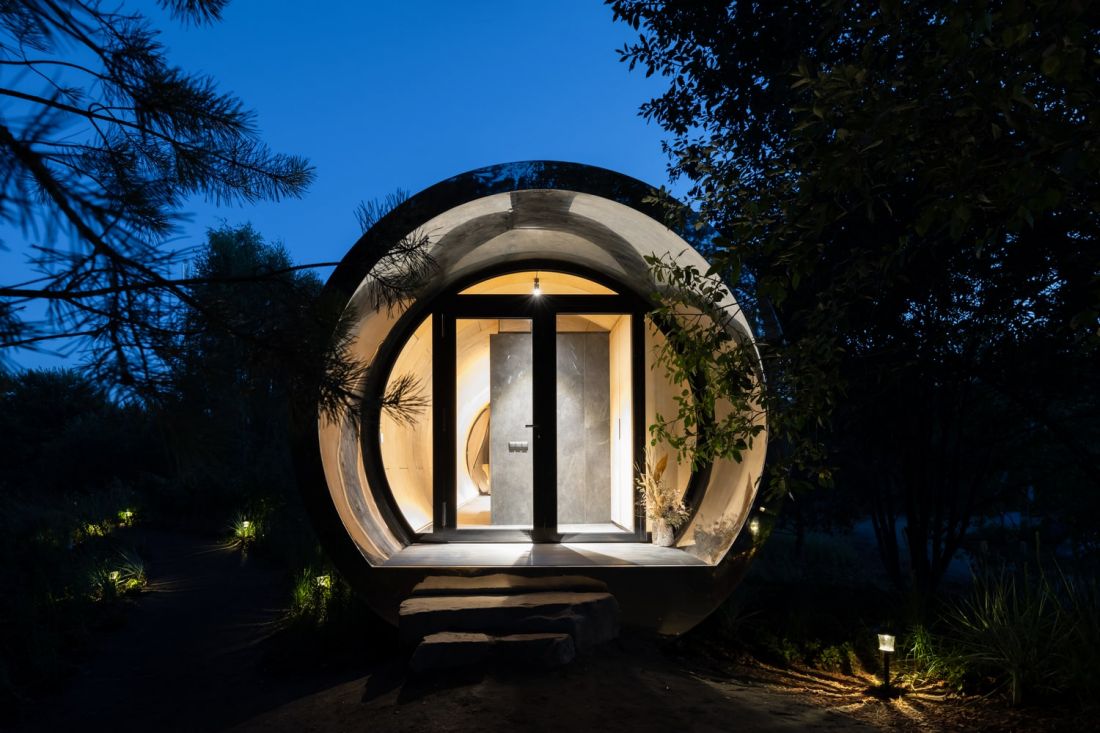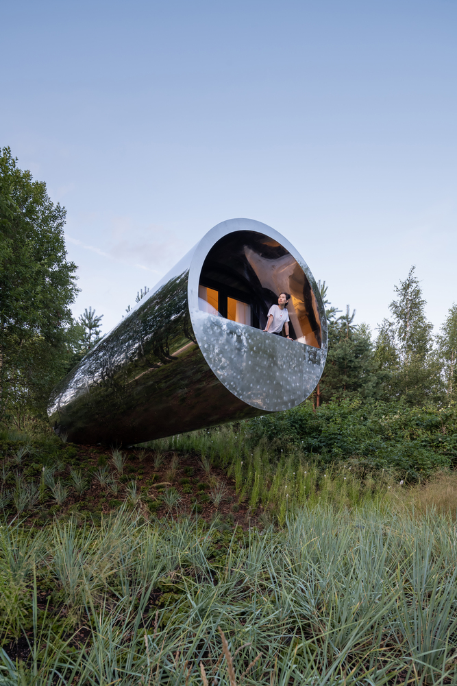 Với lớp vỏ thép không gỉ dày 4mm sáng bóng nên sẽ phản chiếu khung cảnh xung quanh, vì vậy từ xa ta có cảm giác như lơ lửng giữa những đám cây.