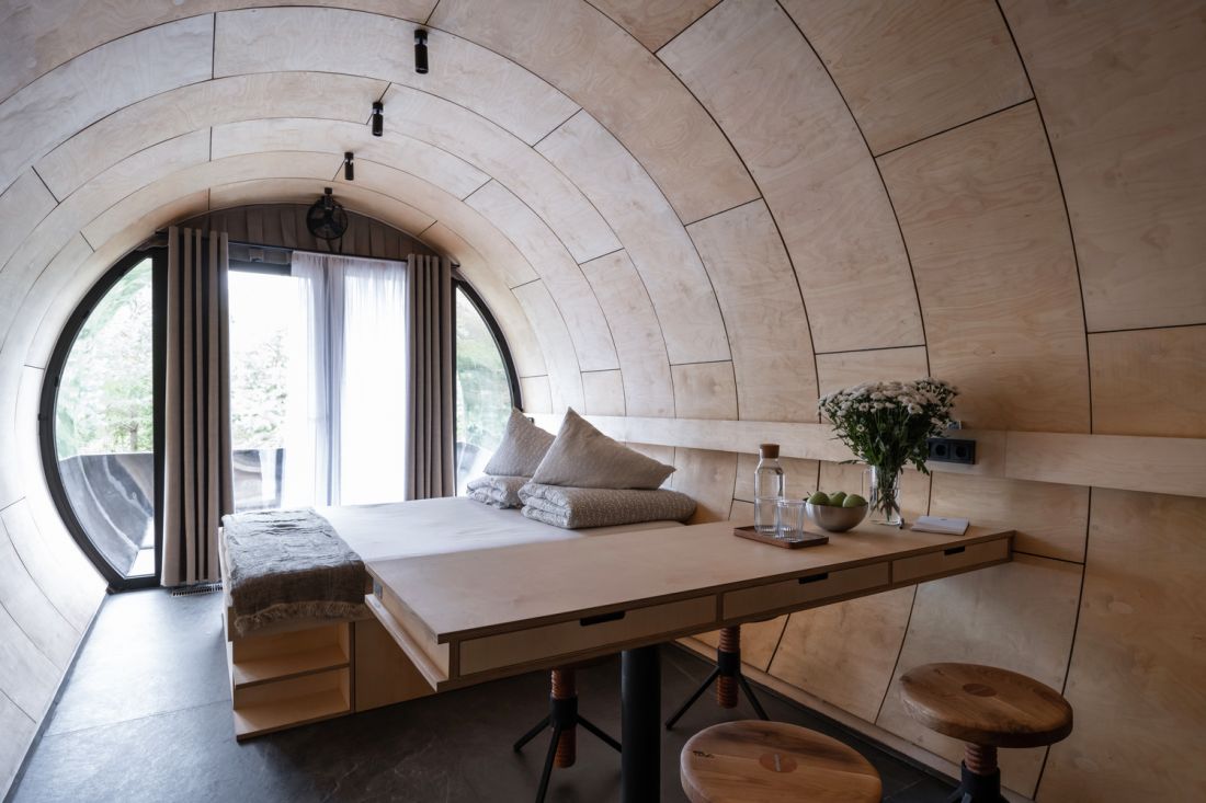 Bên trong nhà, những bức tường và trần nhà ốp gỗ được uốn cong tạo cảm giác ấm cúng và có thể nhìn trọn khung cảnh xung quanh. Tuy diện tích không lớn nhưng vẫn có bếp, khu vực ăn uống, phòng tắm và không gian nghỉ ngơi kết nối với sân ngoài.