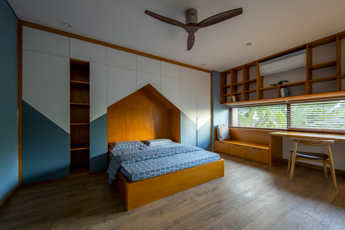 Phòng ngủ thứ nhất năng động với gam màu xanh, nhưng vẫn theo phong cách tối giản.