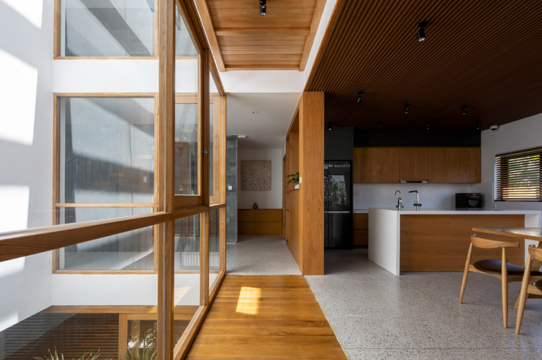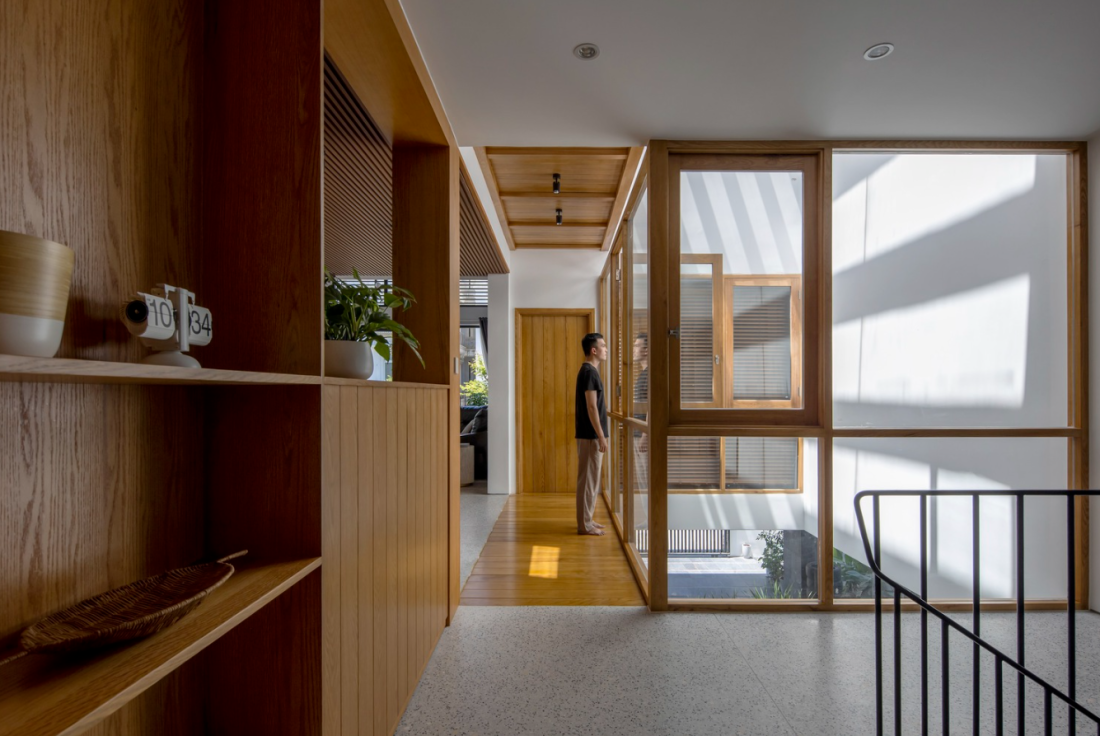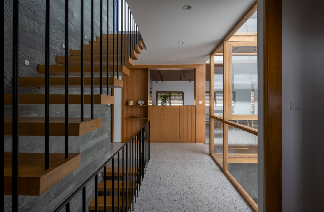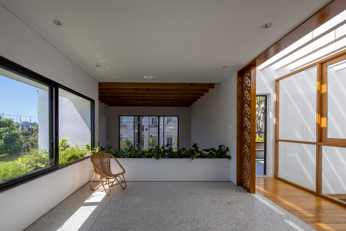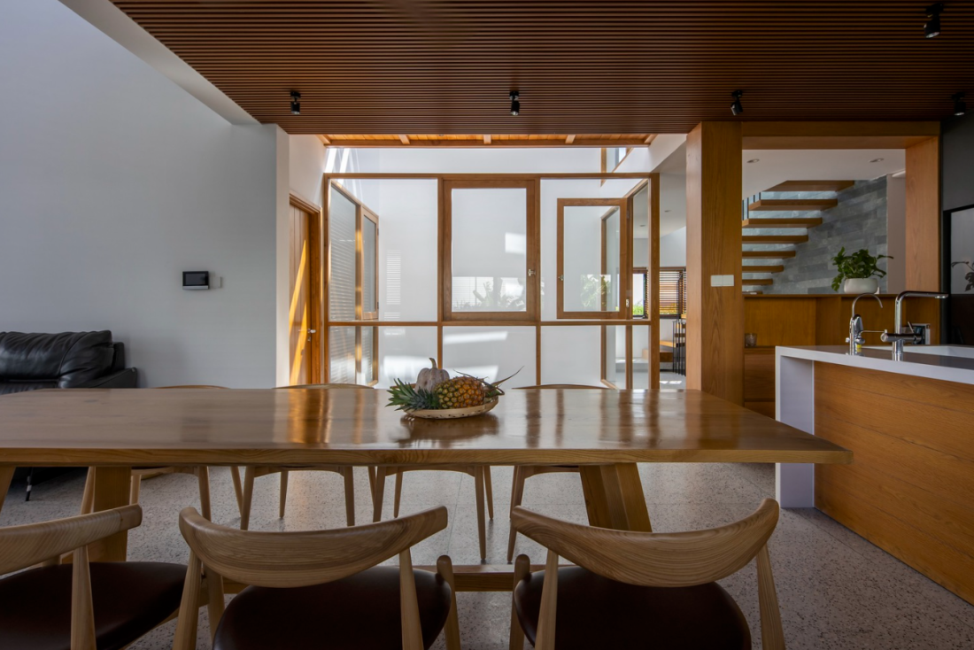 Bằng cách sử dụng vật liệu tối giản và đồng nhất như tường trắng, nội thất bằng gỗ tự nhiên tạo cho không gian sống trở nên sáng sủa và thân thiết hơn. Thiết kế này mang đến sự tinh tế, ổn định và ấn tượng cho nội thất tổng thể của ngôi nhà phố 1 trệt 2 tầng điển hình tại Đà Nẵng. Ngôi nhà được hoàn thiện trong 2022, chi phí không được tiết lộ.