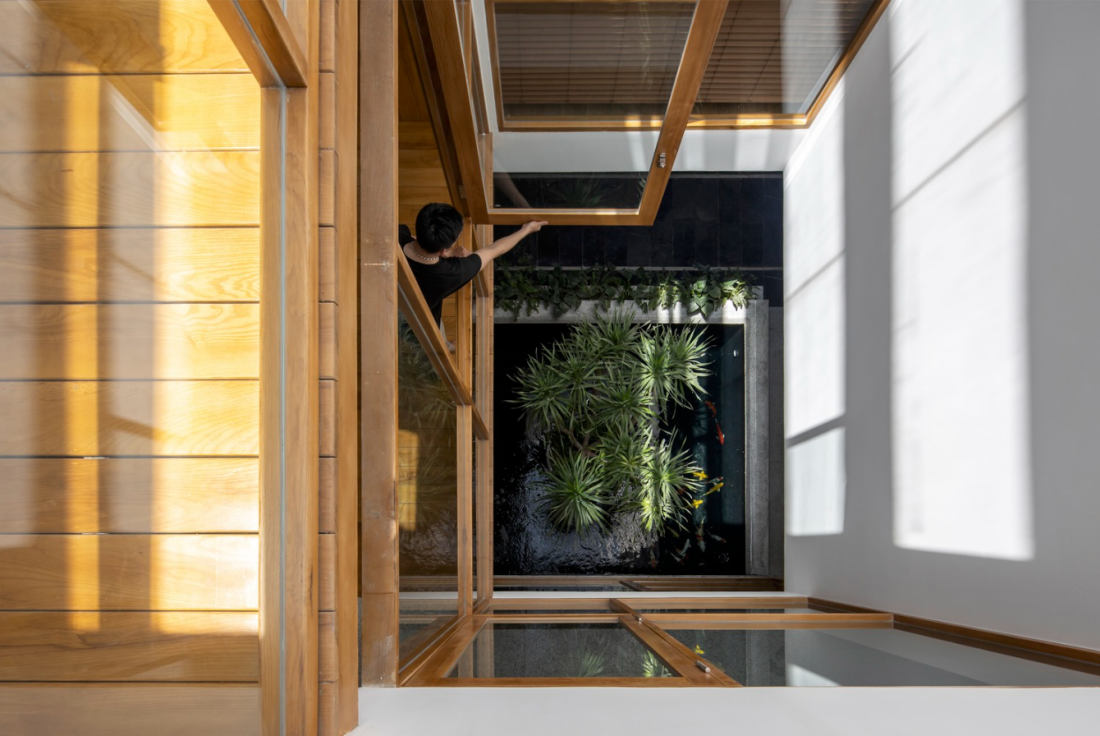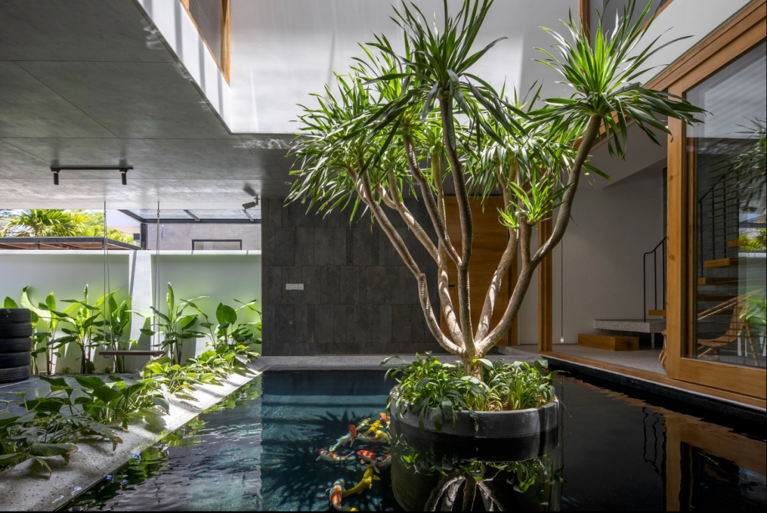 Sân trong là trục kết nối các không gian chính với hồ nước và cây xanh. Tất cả các thành viên trong gia đình luôn có thể nhìn thấy và trò chuyện cùng nhau, tạo nên sự gần gũi hơn.