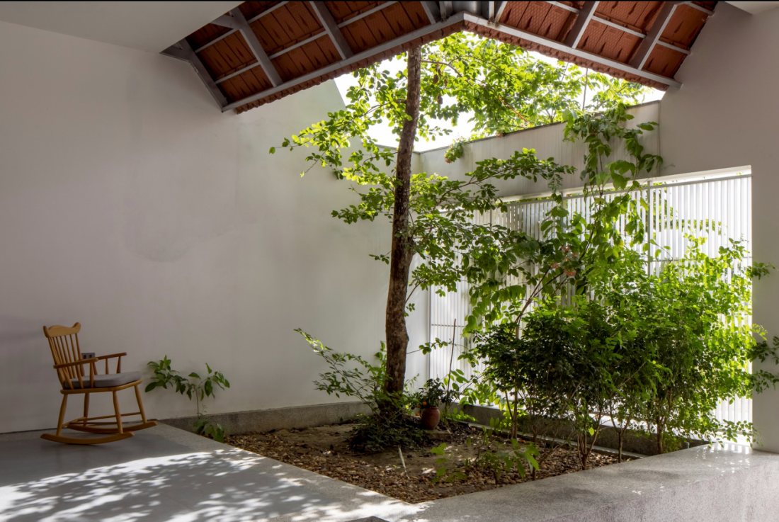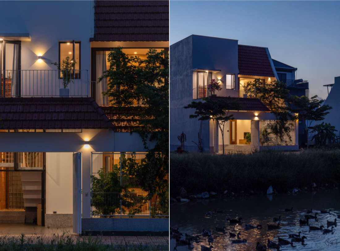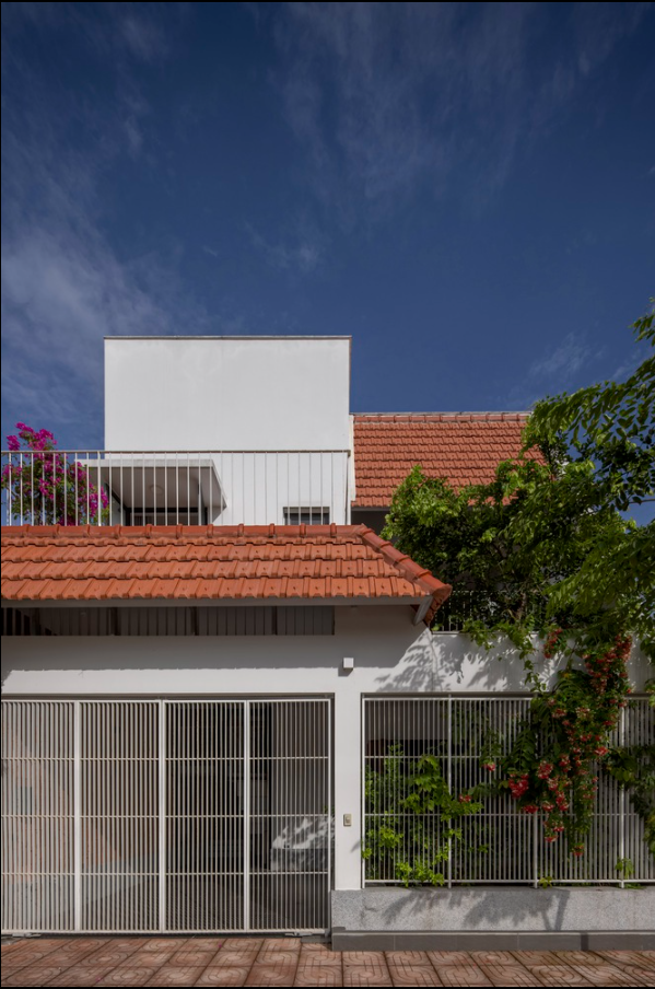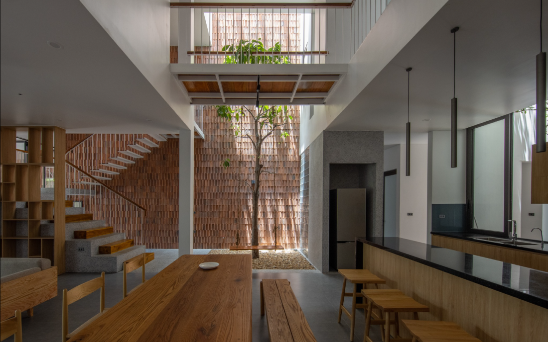 Vẻ đẹp đơn giản của ngôi nhà thể hiện qua cách sử dụng vật liệu chính là gỗ, gạch nung, làm bật nét độc đáo riêng biệt của từng không gian. Bên cạnh đó, mặt tiền, hàng hiên lợp ngói đỏ truyền thống ngoài vai trò trang trí còn giúp hạn chế hấp thụ nhiệt độ từ nguồn ánh sáng chiếu vào. Ngôi nhà được hoàn thành với chi phí khoảng 2,2 tỷ đồng.