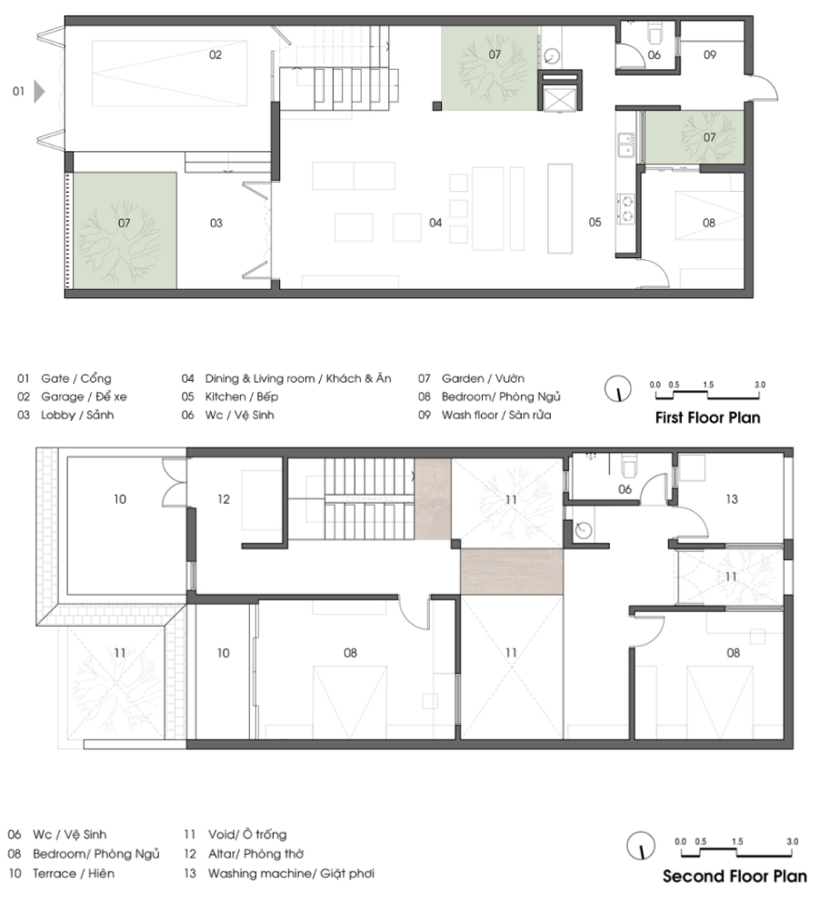 Tầng 2 gồm 2 phòng ngủ, phòng thờ, khu vực phơi phóng. Đan xen các khoảng trống là giếng trời và hành lang chuyển tiếp.