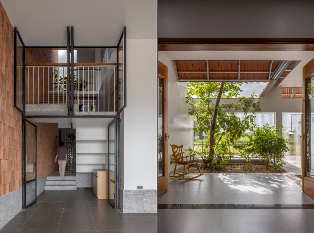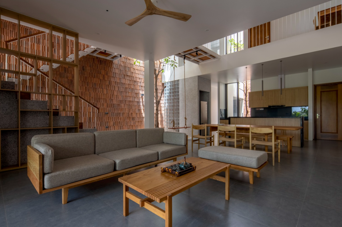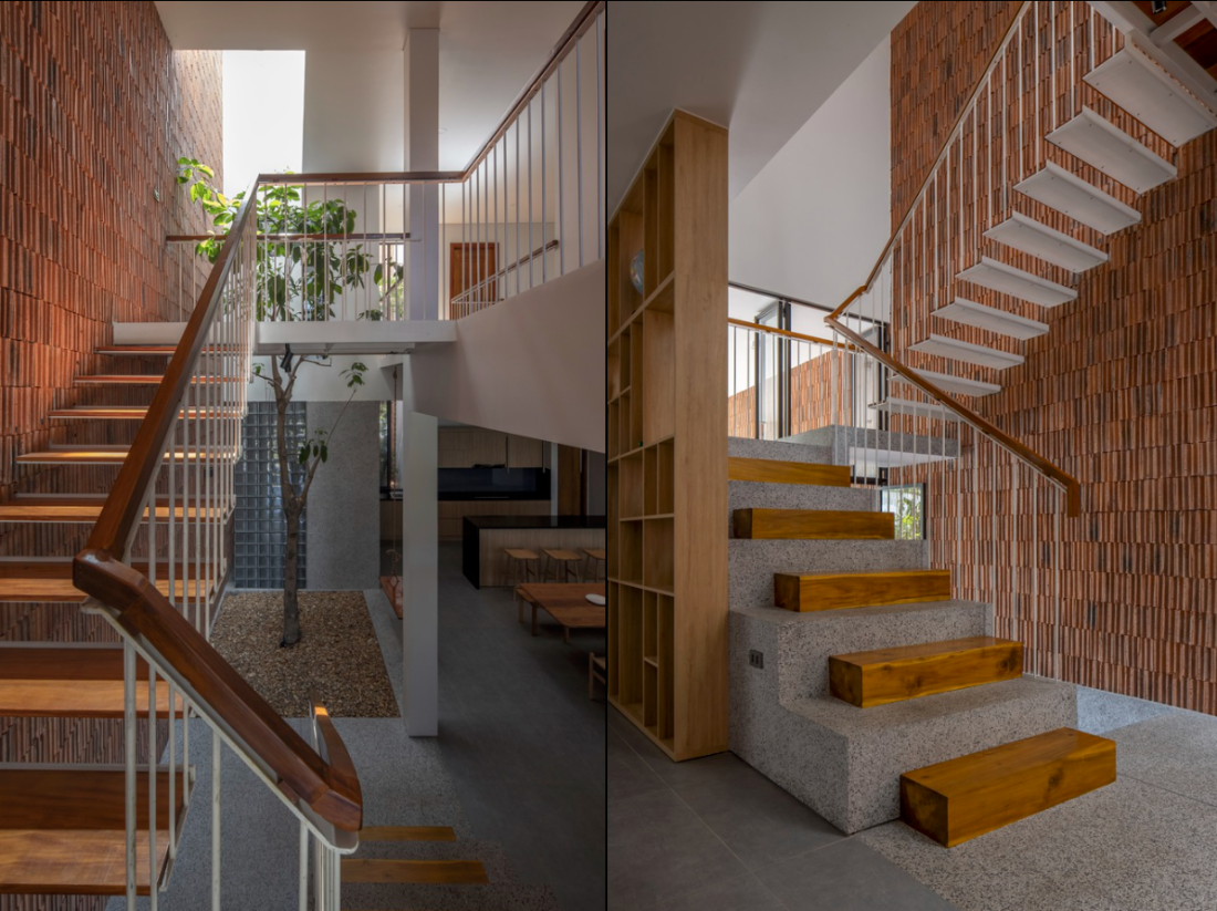 Các yếu tố chi tiết nội thất được khéo léo thêm vào như bậc thang, tường ốp gạch nung đỏ.
