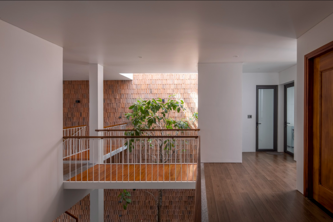 Một chiếc cầu nhỏ liền kề giếng trời bắt qua khối không gian trước và sau tầng 2 không chỉ giúp tối ưu hóa ánh sáng tự nhiên mà còn mang đến luồng gió trong lành.