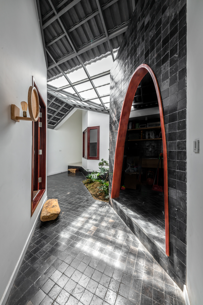 Bên trong nhà có ba giếng trời giúp cải thiện lưu thông không khí trong nhà, tăng lượng ánh sáng và gió tự nhiên. Đây là những yếu tố cần thiết để làm hài hòa cảm xúc của các thành viên.