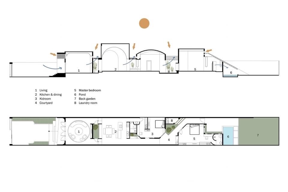 Tư duy thiết kế được vận dụng triệt để, để đưa ra giải pháp trong việc cắt giảm các hành lang dài và nhàm chán, mà các nhà thấp tầng với chiều sâu lớn thường xuyên gặp phải.