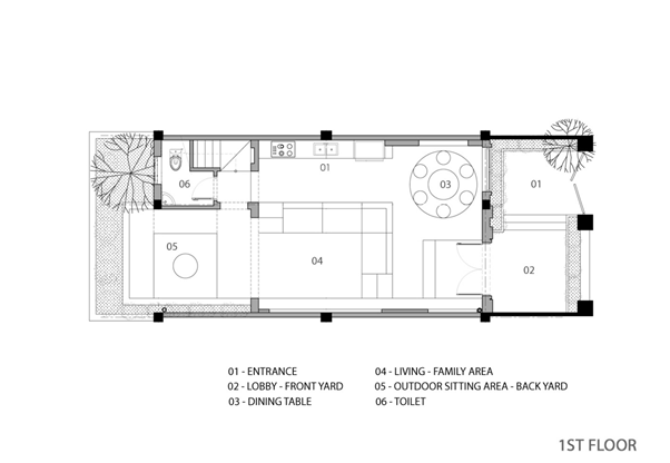 Tầng 1 - không gian sinh hoạt chung của gia đình có vườn trước và sau, ở giữa là không gian sinh hoạt chính được thiết kế như một phần của các khu chức năng bao quanh phòng khách, bếp ăn, và một WC nhỏ.