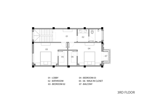 Tầng 3 – 2 phòng ngủ cho trẻ. Mỗi phòng ngủ đều có cửa sổ thông gió tự nhiên và phòng tủ quần áo riêng.