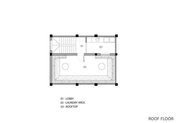 Tầng mái – tầng này được thiết kế để bố trí máy giặt và máy sấy khô cũng như phòng lưu trữ đồ gia dụng. Sân thương ngoài trời là sân phơi có bố trí hệ thống kỹ thuật.