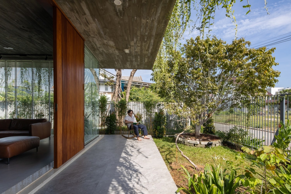 Hệ thống cây xanh trong nhà kết hợp với mái bê tông có độ vươn lớn và hệ lam gỗ giúp bảo vệ ngôi nhà khỏi tác động xấu của thiên nhiên.