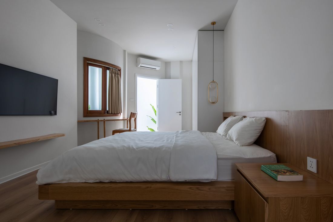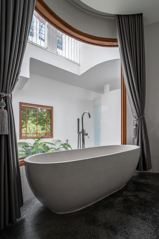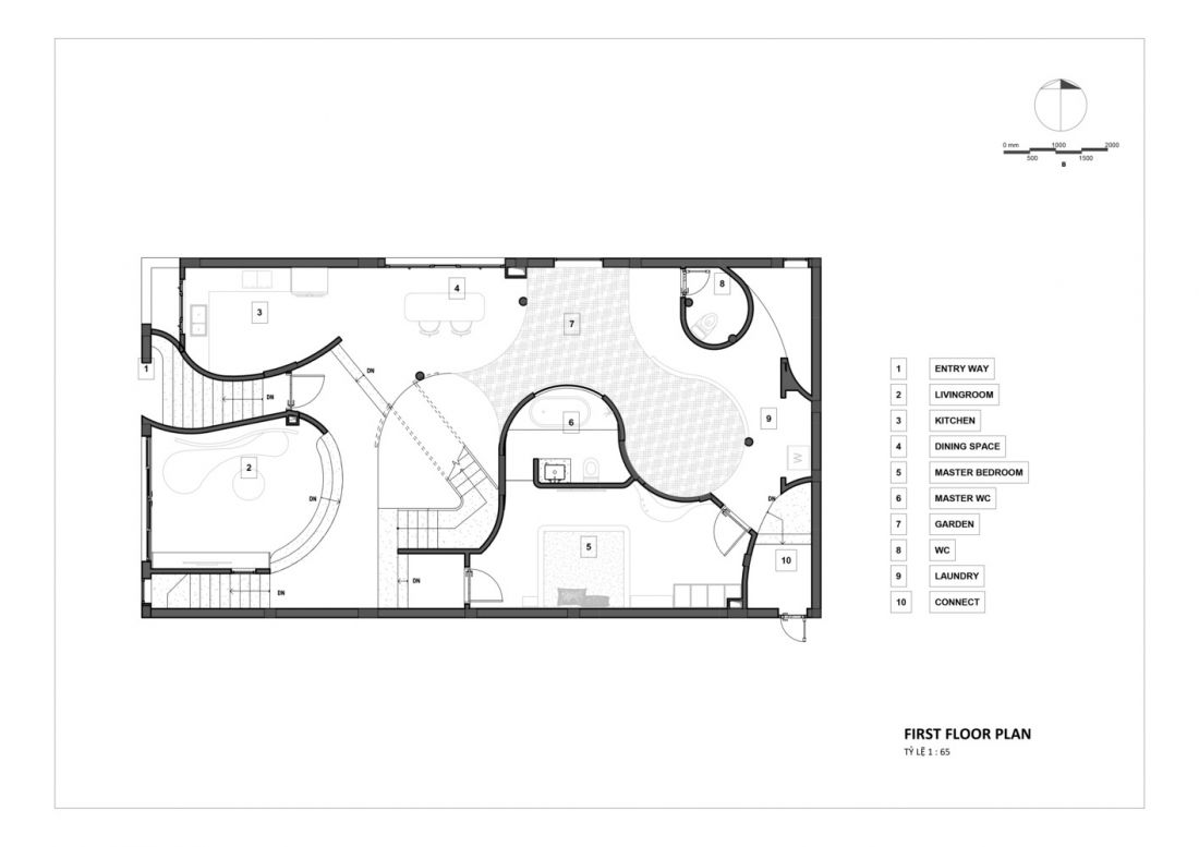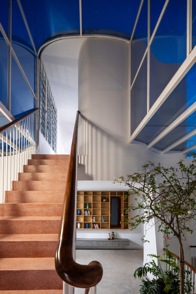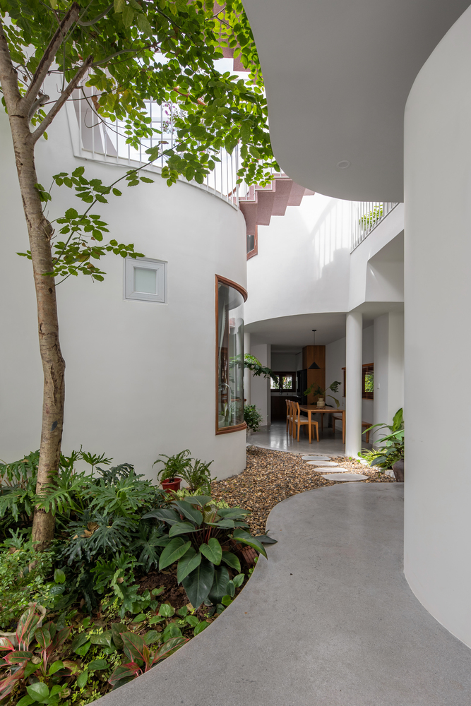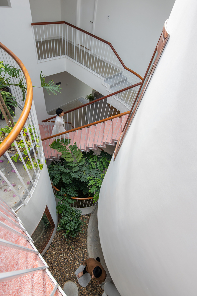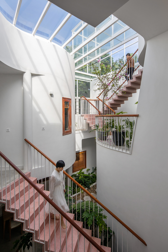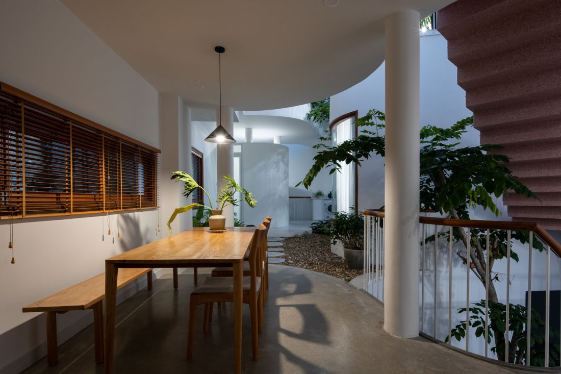 Trong nhà, không gian uốn lượn đã mang đến cái nhìn và trải nghiệm thú vị. Đồng thời phần rỗng của ngôi nhà cũng chính là lá phổi – nơi tập trung ánh sáng, gió, cây xanh.