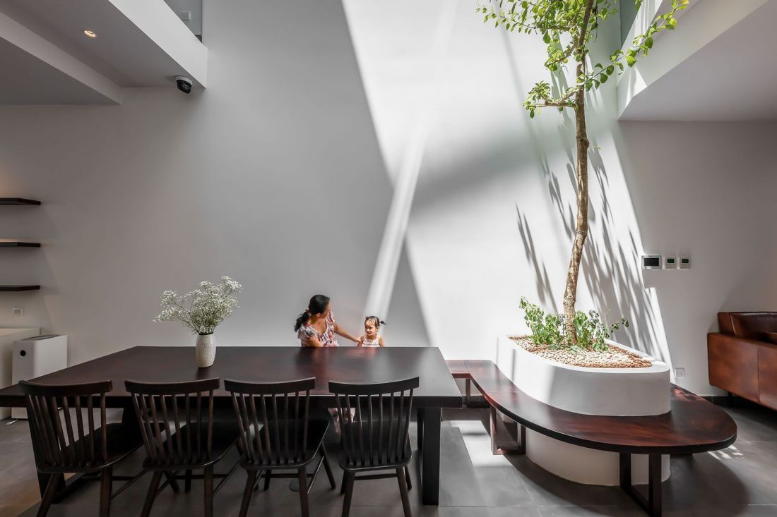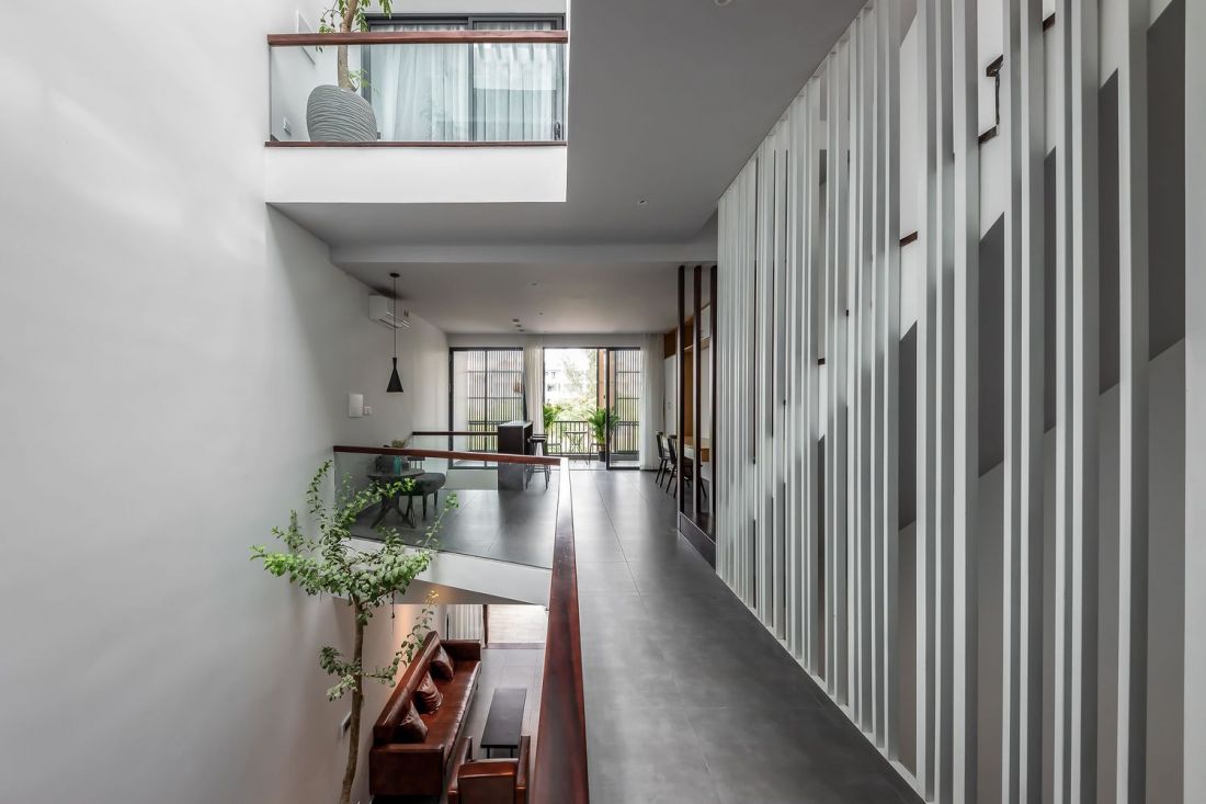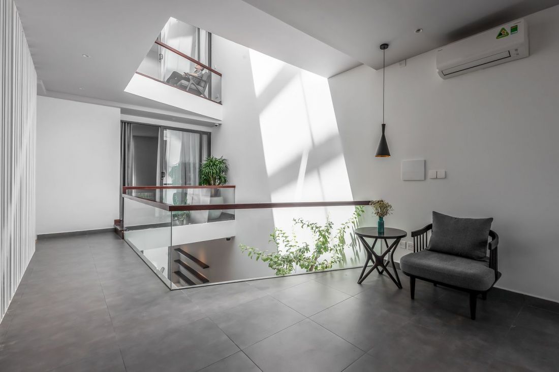 Giải pháp là thiết kế không gian thông tầng xuyên suốt nằm kế lõi thang, tạo nên sự kết nối các tầng bằng thang bộ và không gian thông tầng. Trước cửa các phòng ngủ còn được thiết kế logia dành riêng cho từng thành viên.