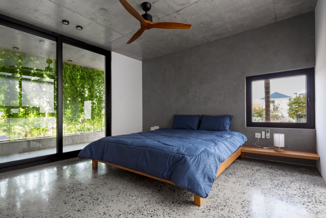 Phòng ngủ Master thiết kế tối giản, từ đây gia chủ có thể nhìn thấy màu xanh của dây leo và đón ánh sáng trong ngày.