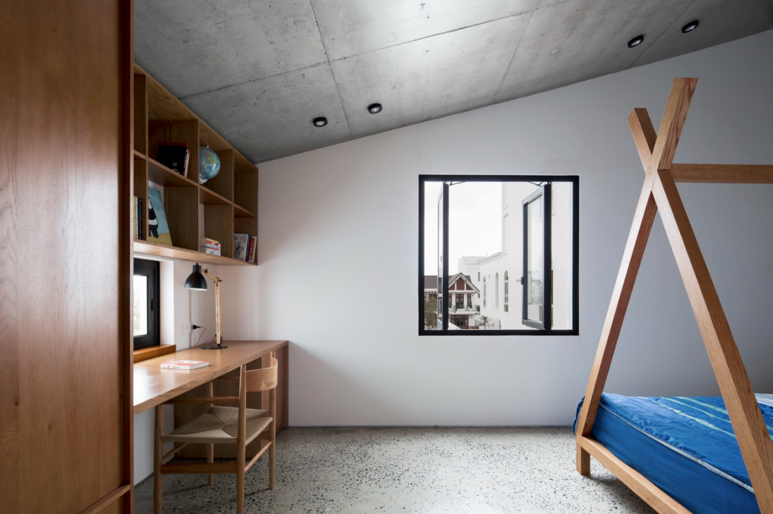 Một góc bàn học trong phòng ngủ của con tràn ngập ánh sáng và gió từ hệ cửa sổ.