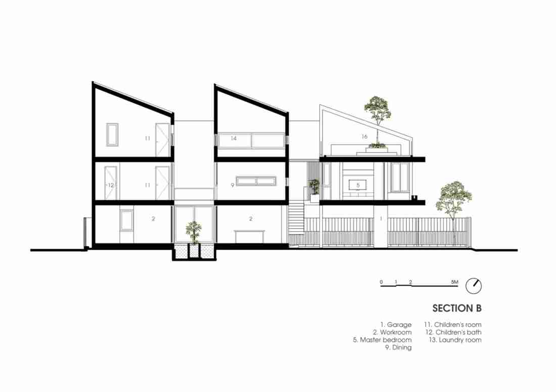 Mặt cắt kiến trúc nhà phố 3 tầng tối giản đậm chất riêng vừa để ở vừa làm văn phòng tại Đà Nẵng.