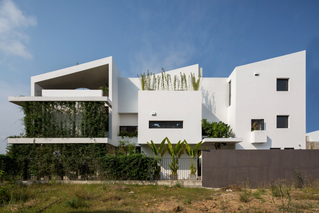 Mặc dù ngôi nhà cao 3 tầng nhưng hệ mái phía trước được thiết kế thấp hơn tránh tạo cảm giác nặng nề và tạo ra tỷ lệ chiều rộng hơn chiều ngang. Kiến trúc của ngôi nhà được thể hiện qua các khối hình học đơn giản, vật liệu tự nhiên mộc mạc như bê tông trần và sàn đá mài mang tính bền vững theo thời gian.
