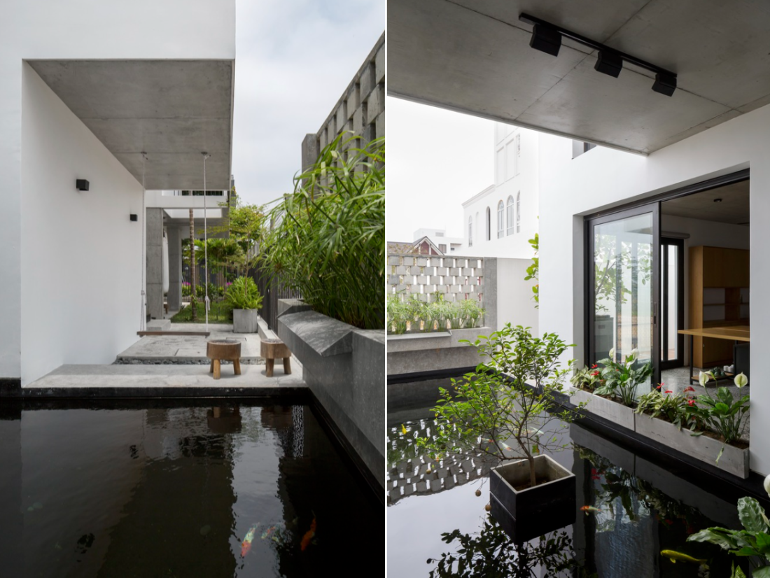 Hồ nước được tạo thành giữa hai khối chính không chỉ có tác dụng làm mát không khí trong nhà vào những ngày nắng nóng mà còn ví như tiểu cảnh mini nên thơ, lãng mạn.