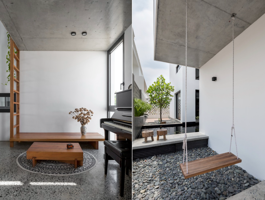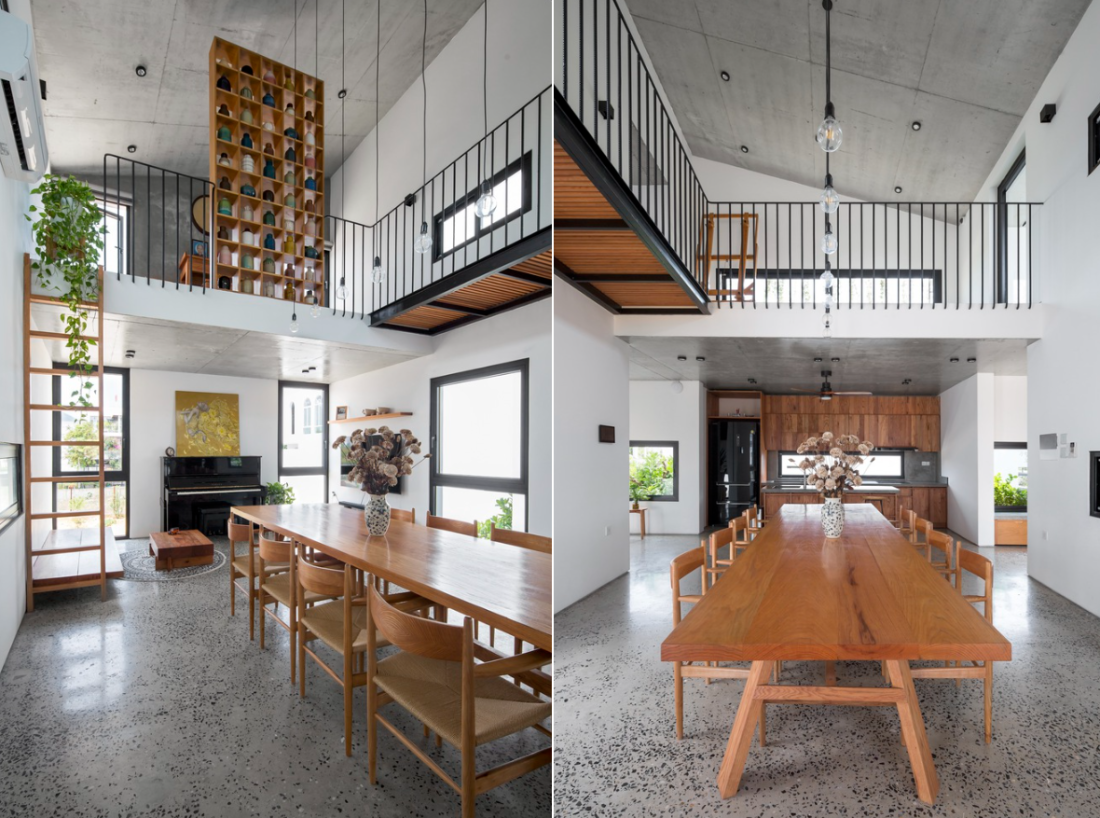 Những không gian kết hợp giữa vật liệu đơn giản, ánh sáng tự nhiên và cây xanh mang lại trải nghiệm thú vị cho thành viên sống bên trong ngôi nhà.