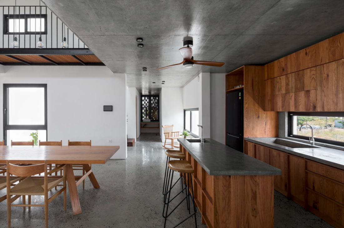 Một góc gian bếp mộc mạc khi kết hợp giữa vật liệu gỗ, đá mài và bê tông.