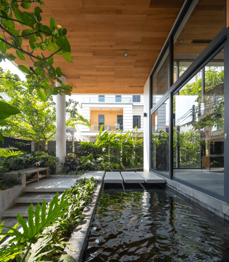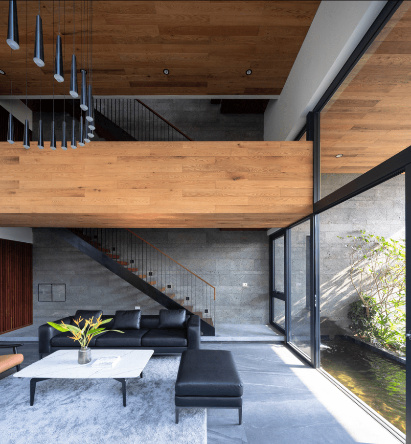 Bên cạnh đó gỗ được sử dụng xuyên suốt các không gian trong thiết kế tạo sự nhịp nhàng, mang lại cảm giác mát mẻ và ấm cúng.