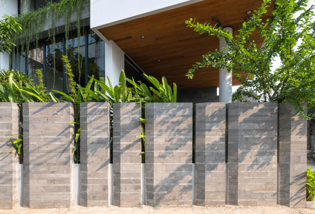 Hàng rào đá ong tạo sự đối lập với những mảng tường sơn trắng làm giảm cảm giác nặng nề mang lại tổng thể chung nét kiến trúc hiện đại.