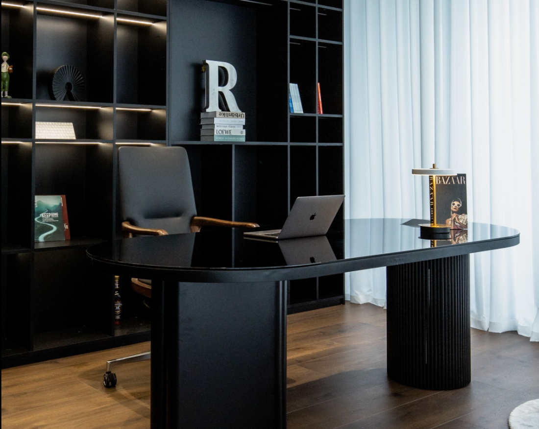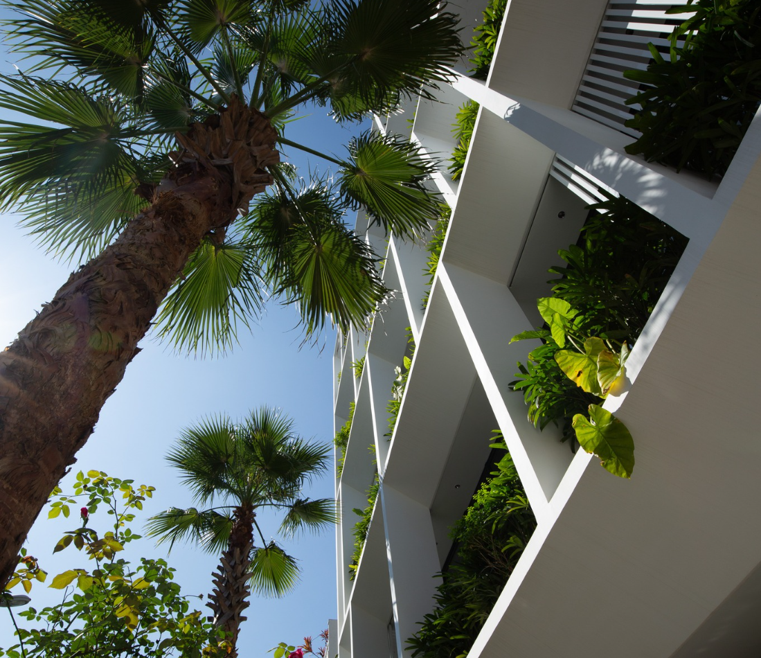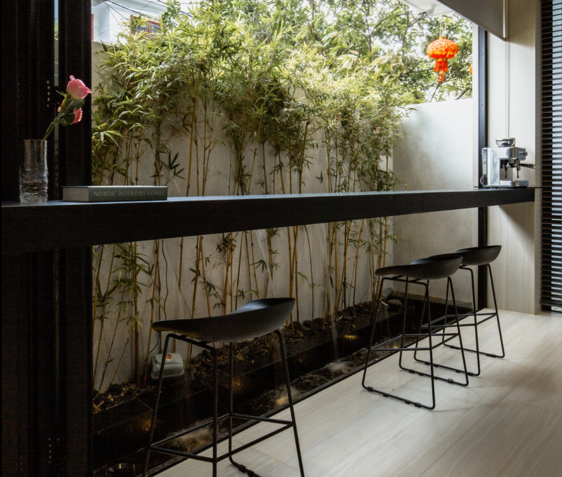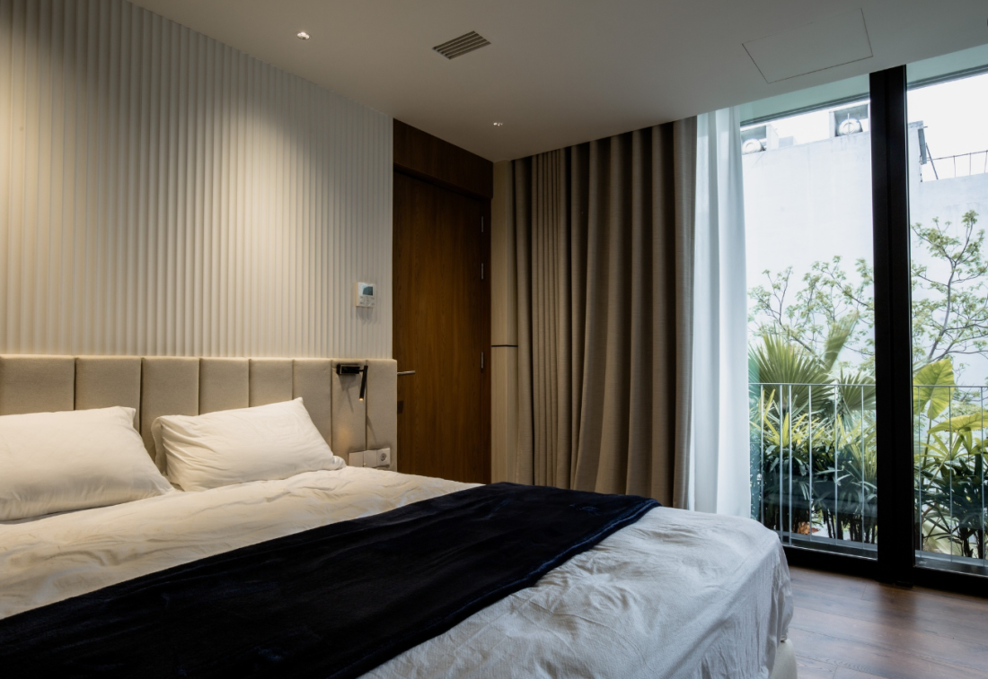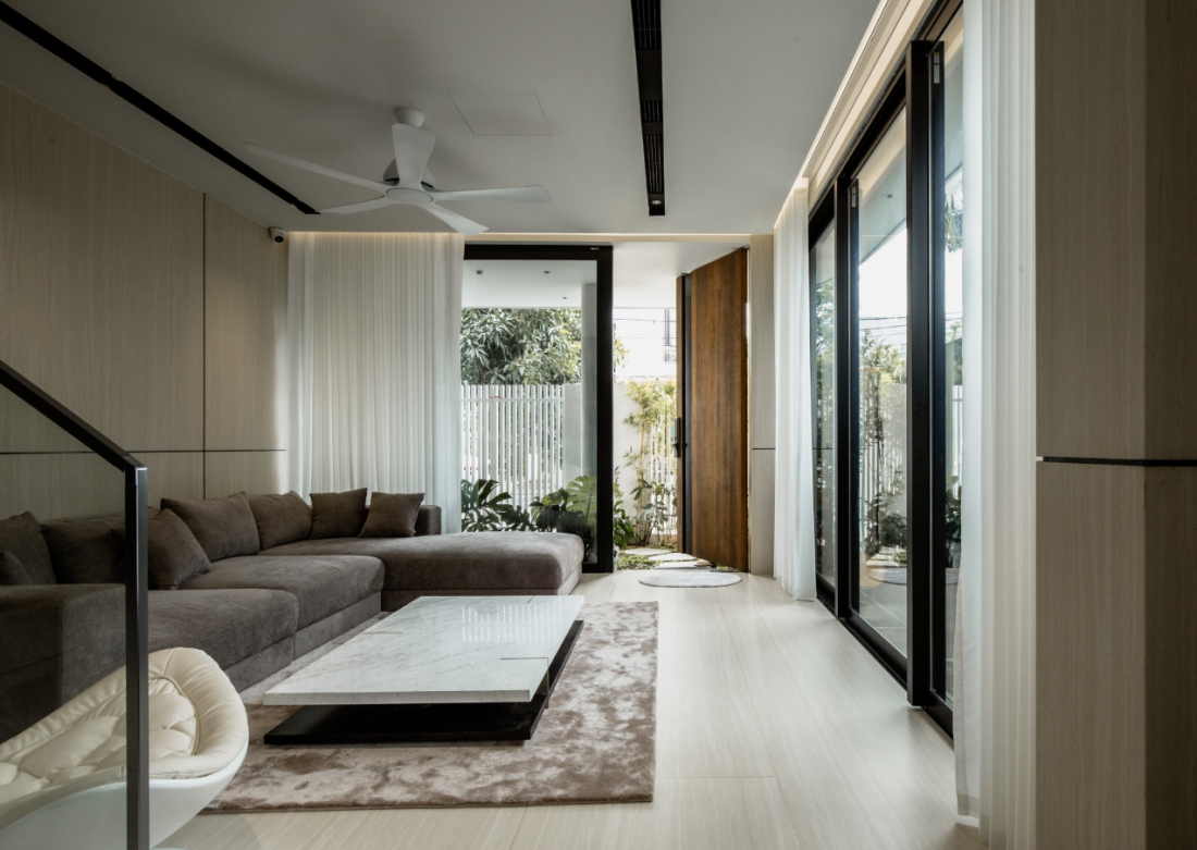 Hệ thống cửa kính và tường kính nhiều lớp giúp giảm tiếng ồn từ bên ngoài hiệu quả. Điểm nhấn là những thanh lam dọc và rèm sắt di động, kết hợp cùng cây xanh, vừa tăng tính riêng tư, vừa giảm thiểu tiếng ồn từ đường phố.