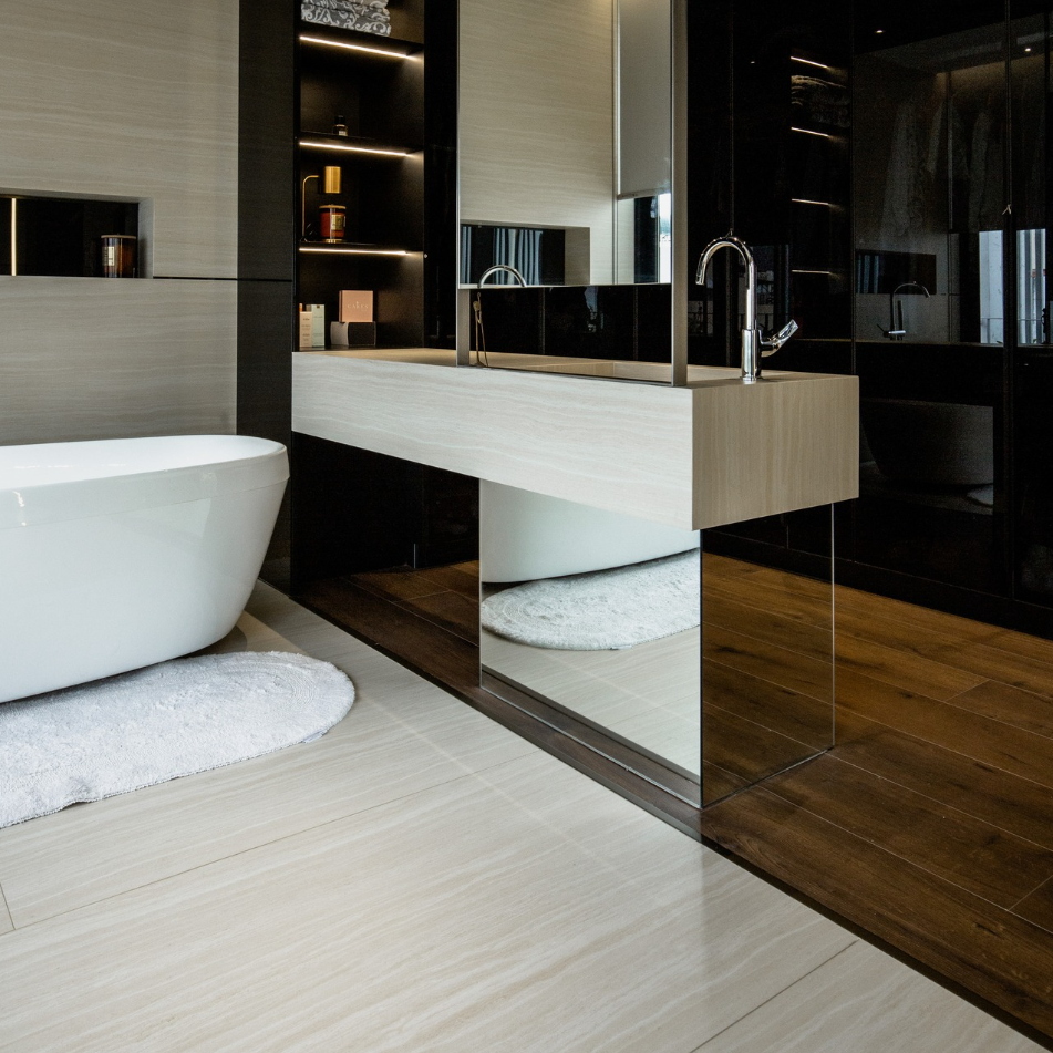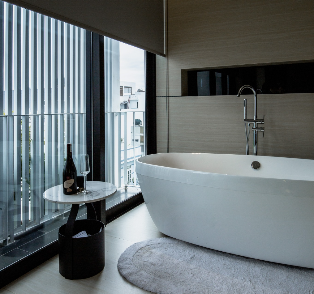 Phòng tắm chính nằm ở phía Tây, với hệ thống lam di động vừa đảm bảo sự riêng tư, vừa giữ cho không gian luôn sạch sẽ, thoáng mát. Mỗi chi tiết đều được chăm chút để mang lại trải nghiệm thư giãn tối đa, như một spa nhỏ ngay trong nhà.