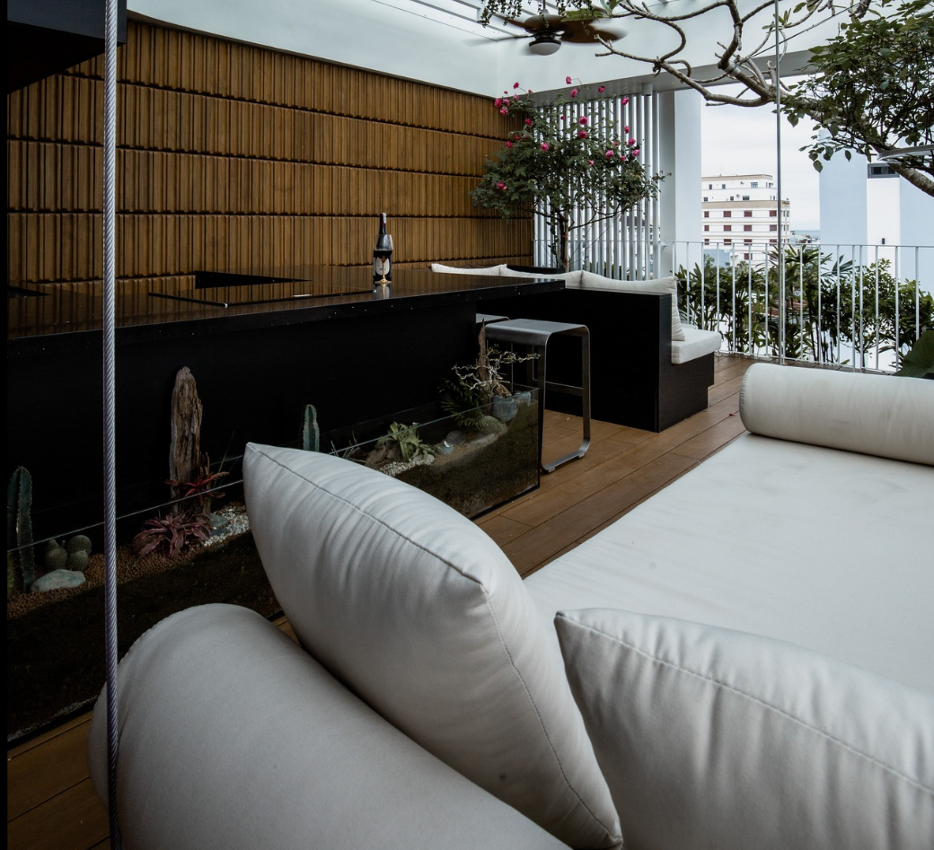 Ở tầng trệt, phòng khách và nhà bếp được bố trí mở, bao quanh bởi cây xanh nhiệt đới, tạo sự riêng tư mà vẫn đón được ánh sáng tự nhiên. Gió biển mát lành luồn qua không gian mở giữa phòng khách và bếp, mang đi hơi nóng từ khu vực nấu nướng. Đặc biệt, hồ cá ở phía Tây không chỉ làm đẹp mà còn tạo độ ẩm, làm dịu đi những cơn gió Tây Nam nóng khô.