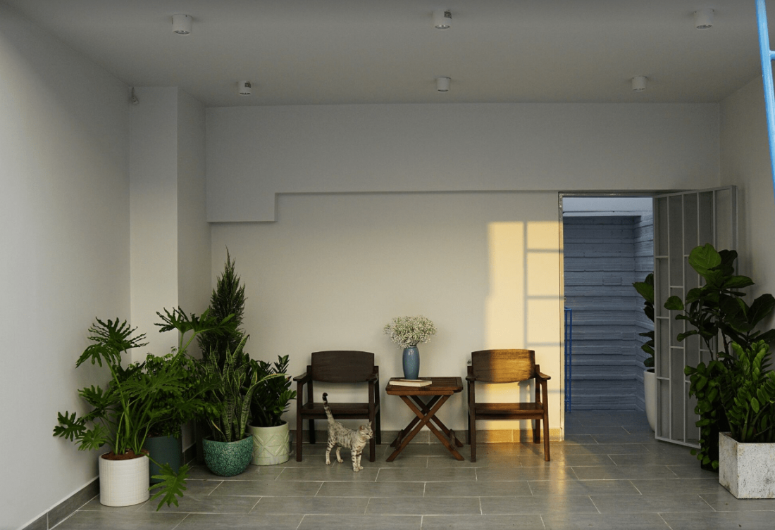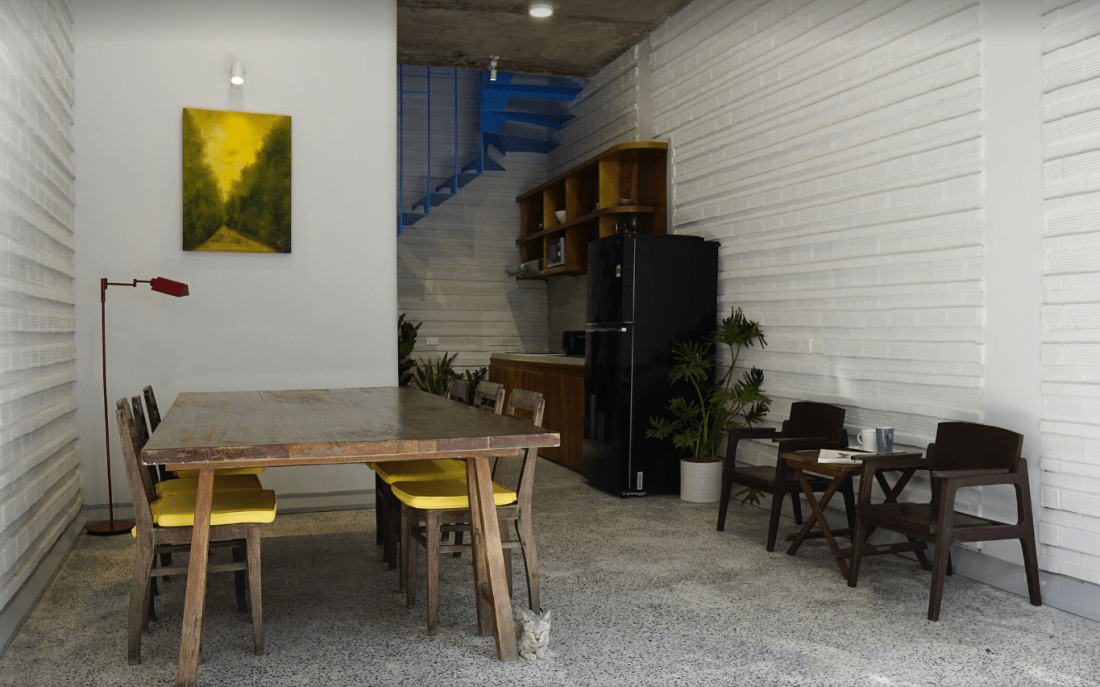 Nhà phố 3 tầng, trong đó tầng 1 và 2 tương ứng 2 căn hộ nhỏ, không gian riêng tư đều được tính toán diện tích sử dụng tối đa, phục vụ mục đích kinh doanh. Trong khi các không gian chung đan xen với nhau kết hợp cách tư duy mới về các vật liệu cơ bản để tạo nên nét thú vị cho công trình và tránh sự nhàm chán.