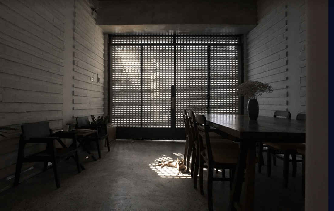 Hơn nữa khi kết hợp với việc sử dụng chất liệu gạch nung thông qua cách xếp gạch trên mặt tiền sẽ tạo cảm giác sống động khiến ta gợi đến hình ảnh dòng kênh Nhiêu Lộc luôn chảy và đổi thay.