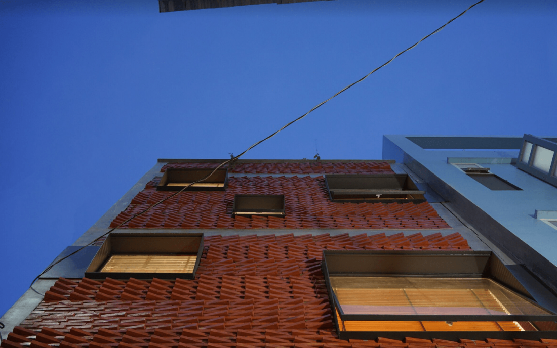 Phần mặt tiền là lớp vỏ bọc ngăn cách giữa các hoạt động bên trong nhà và các hoạt động náo nhiệt diễn ra bên ngoài hẻm. Các ô cửa sổ được tính toán, thiết kế cẩn thận để cung cấp đủ ánh sáng cho nhu cầu sử dụng tại các căn hộ cho thuê.