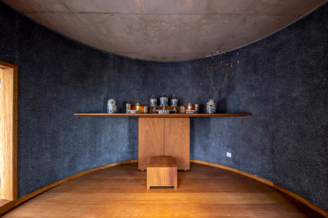 Không gian thờ cúng bố trí tầng trên cùng rất độc đáo được thể hiện qua đường cong, chất liệu và gam màu.