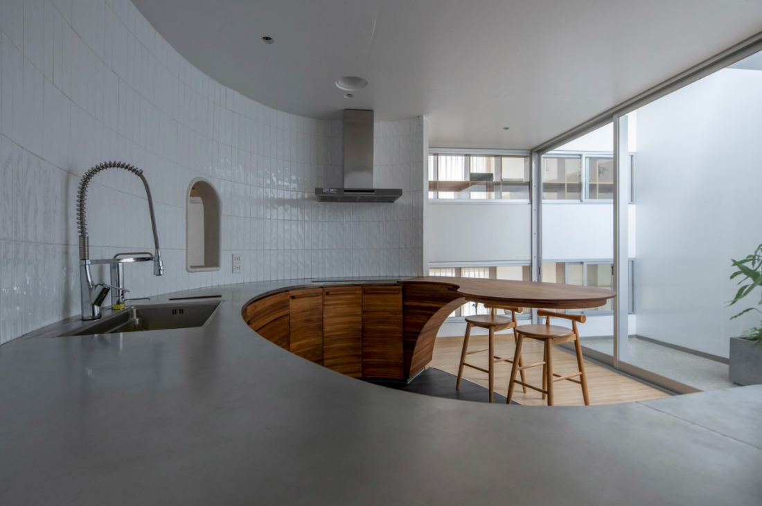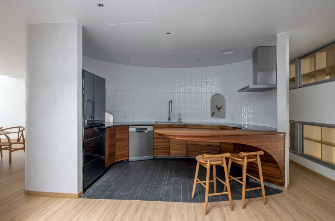 Các không gian sinh hoạt chính tập trung từ tầng 4 trở lên, đặc biệt bếp và khu vực ăn uống, chủ ý thiết kế gồm những dấu ấn đường cong và màu sắc làm nổi bật hẳn không gian cá tính.
