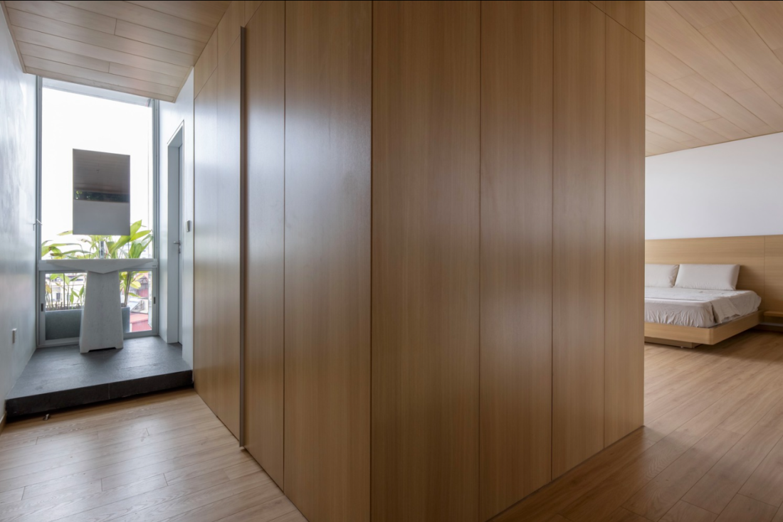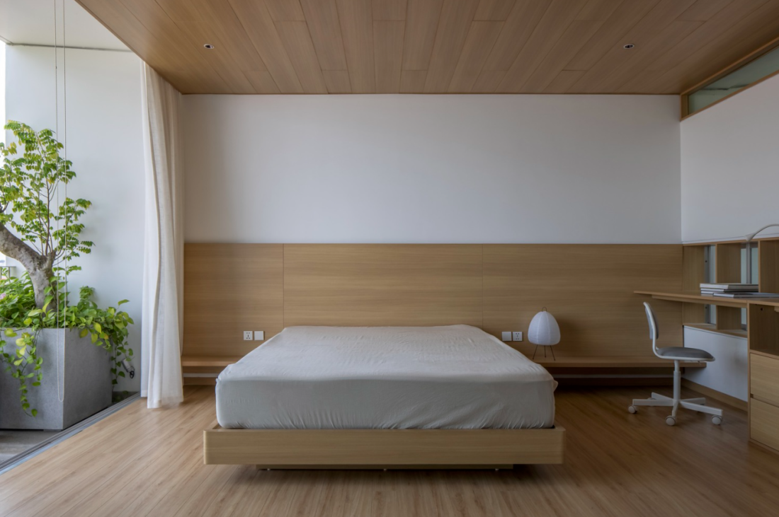 Phòng ngủ Master tại tầng 5, trần và sàn gỗ xen kẽ với những đường nét mạnh mẽ trên đồ nội thất, phần nào phản ánh sở thích của gia chủ.