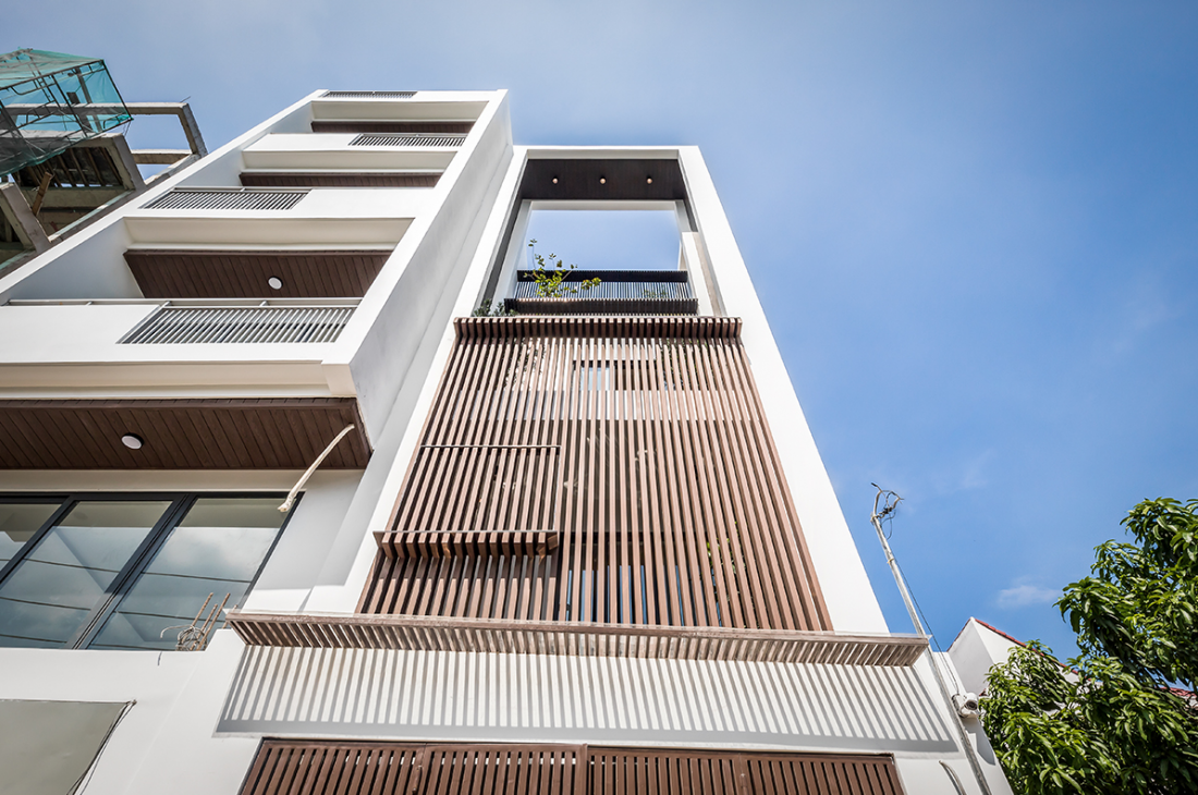 Mặt tiền kết hợp với hệ lam gỗ tạo nên sự sang trọng cho ngôi nhà. Ngôi sau khi hoàn thiện với chi phí 2.8 tỷ đồng đã đáp ứng được ý muốn của gia chủ.