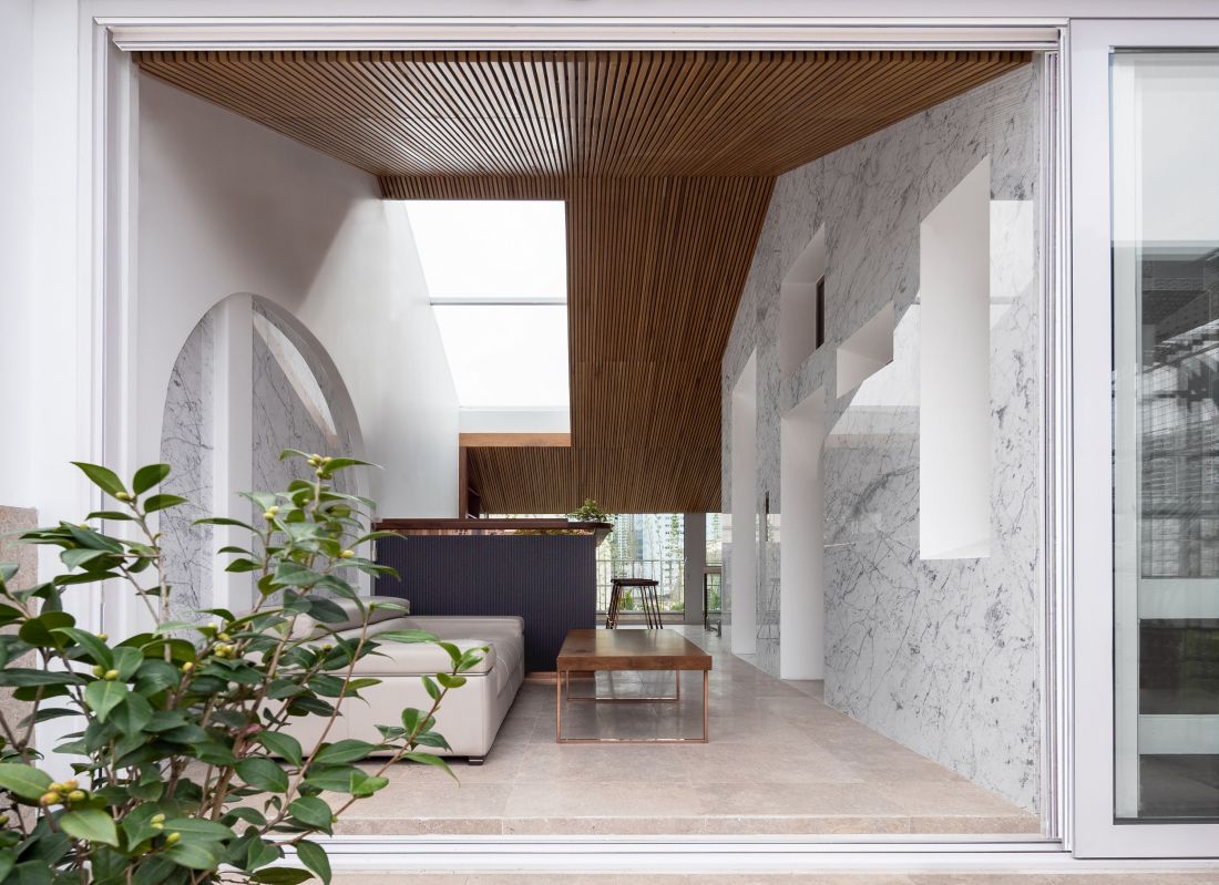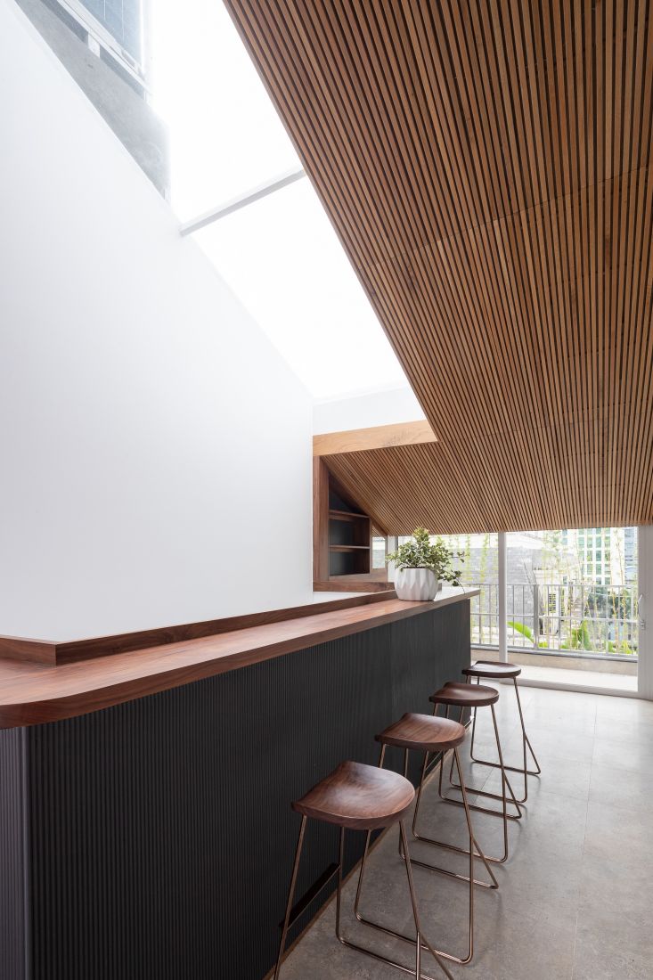 Tầng 6 là không gian thư giãn gồm có quầy bar mini và sân vườn. Khu vực này không có tường nhưng thay vào đó là hệ cửa trượt để tạo sự kết nối từ ngoài vào trong. Hơn nữa sự phối hợp giữa tông màu nâu vàng ấm áp của chất liệu gỗ với màu trắng dịu mát của đá tự nhiên đã biến thành một không gian thư giãn vô cùng thú vị.