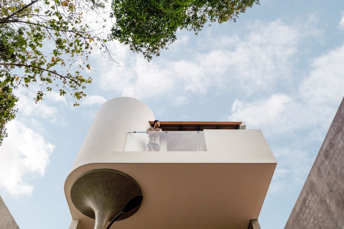 Về phần nghiêng của ngôi nhà cũng được tổ chức lại sao cho phù hợp với khối kiến trúc. Khác với các nhà phố thẳng đứng thông thường thì ngôi nhà này các không gian chức năng được bố trí đẩy lùi phía sau, kết hợp với hệ mái ngói sẽ giảm đi sức nặng tổng thể khi quan sát ở phía trước. Đặc biệt khi bước qua cổng vào bên trong nhà, thì cảm giác như đang đứng ở tầng trên cùng tạo cho người tiếp cận cảm giác thân thiện hơn.