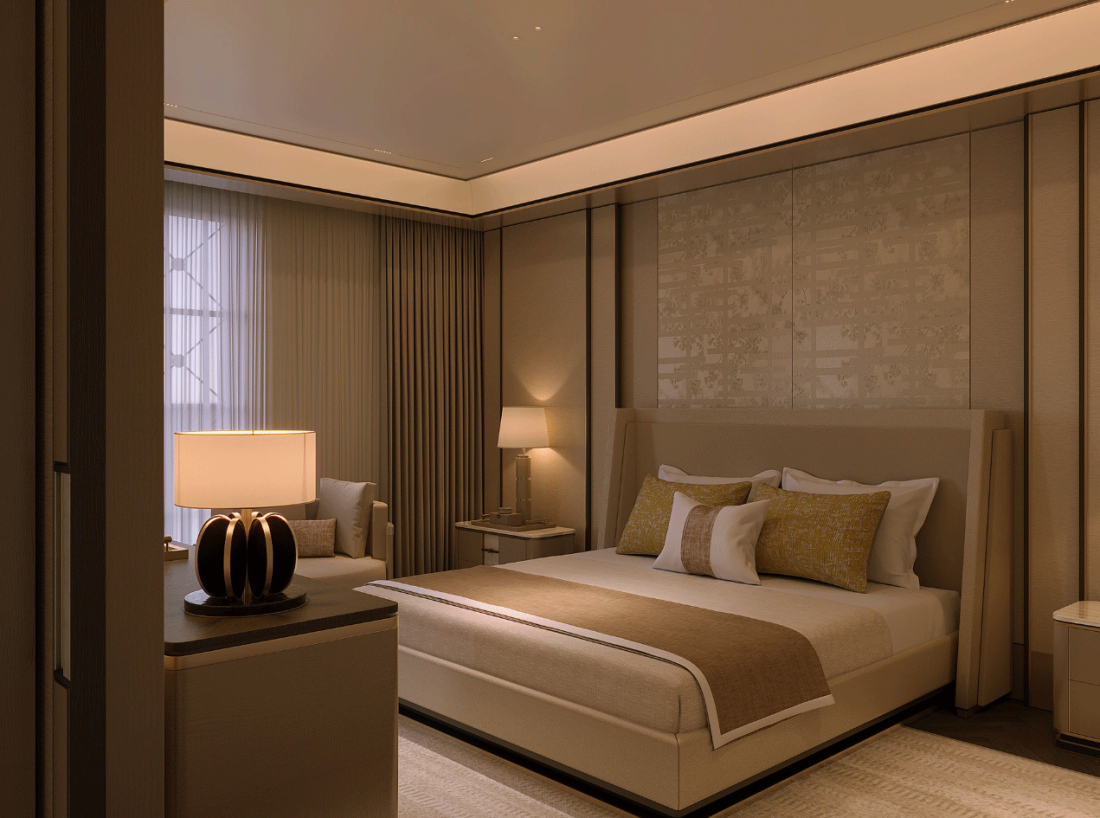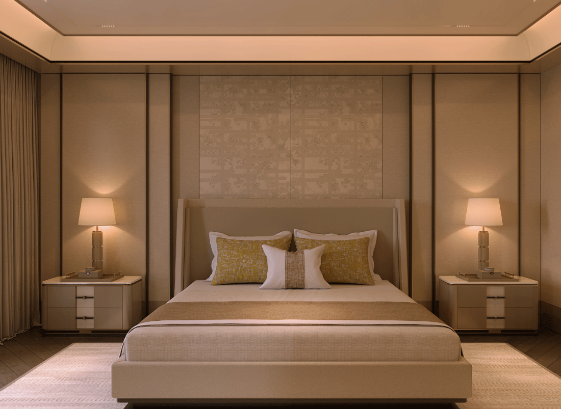 Phòng ngủ với các không gian mở ra với một nhịp điệu nhẹ nhàng, khuyến khích lối sống chậm, sự hiện diện chánh niệm và sự tận hưởng tĩnh lặng những nghi thức hàng ngày.