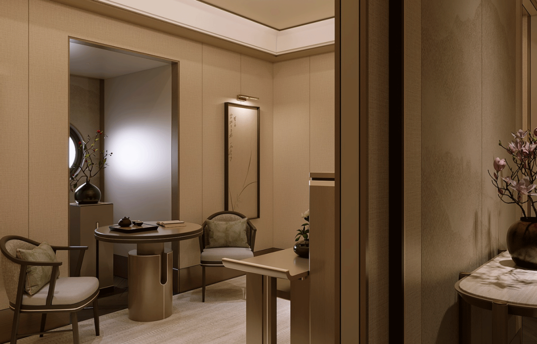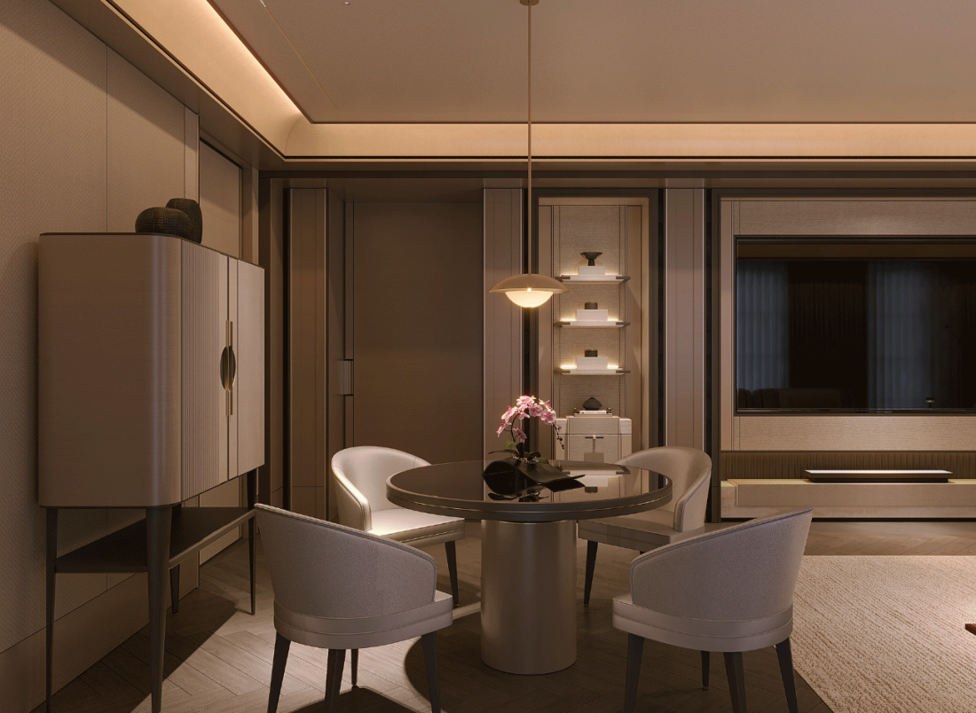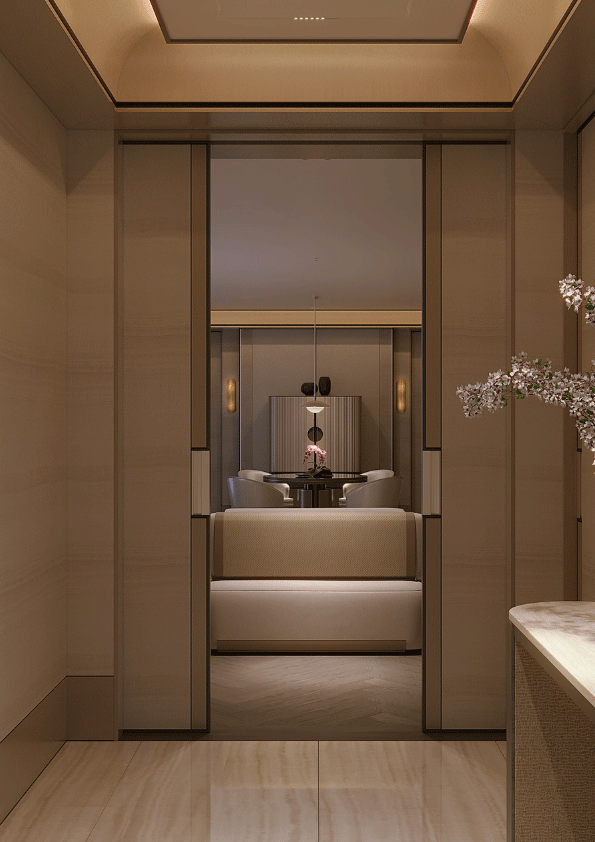 Các chi tiết phào chỉ thanh lịch cùng với các ô cửa kính mở rộng giới thiệu cảm giác tinh tế và sự cởi mở, cho phép ánh sáng tự nhiên nhẹ nhàng định hình bầu không khí nội thất. Các khung hình trên tường, trần được thiết kế tối giản, thanh lịch, tạo nên sự ngăn nắp thị giác và nhấn mạnh tính đối xứng mà phong cách Phương Đông hiện đại đề cao.