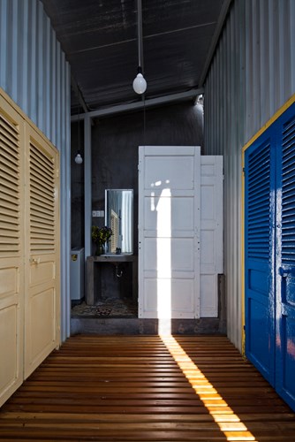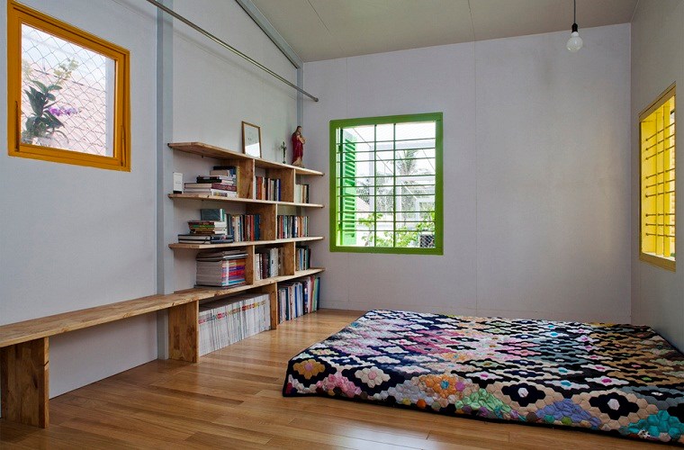 Để thêm tính sinh động, ấm cúng cho nơi sinh sống, chủ nhà đã thiết kế các cánh cửa sơn nhiều màu sắc khác nhau. Toàn bộ phần hành lang độc đáo được ghép hở bằng các thanh gỗ, có thể nhìn xuống tầng 1.