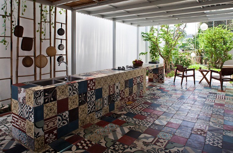 Gian bếp độc đáo về vật liệu gạch ốp có nhiều họa tiết, giá treo đồ gia dụng đơn giản và mang vẻ thô mộc. Đồ đạc đủ dùng và những phần còn lại của nhà bếp để thoáng khiến không gian trở nên rộng rãi hơn.