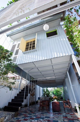 Lan can của cầu thang lên tầng 2 được tận dụng từ các thanh thép, sơn trắng. Các bức tường bê tông cốt thép thay thế hoàn toàn bằng tấm tôn nhẹ.
